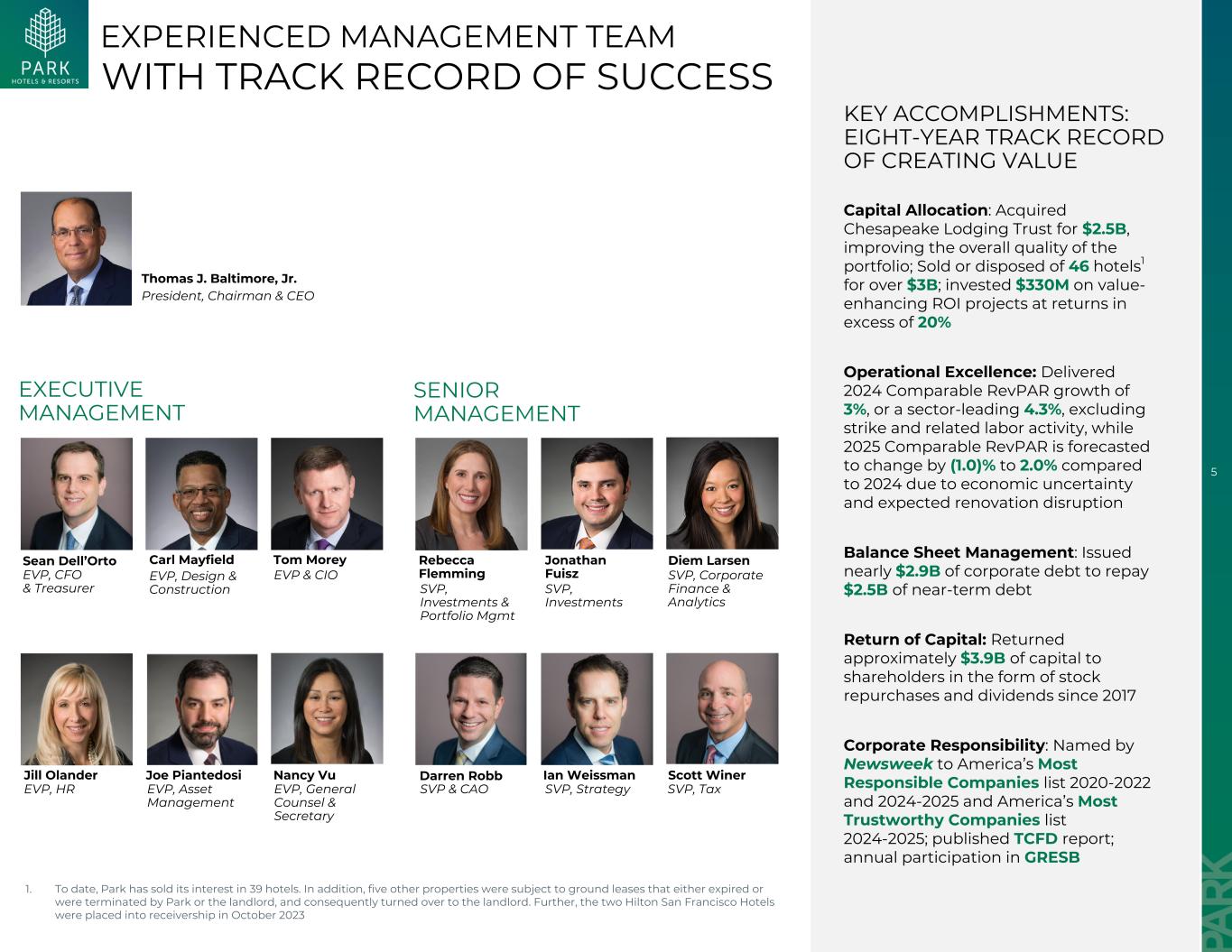 5资本配置:以$ 2.5B的价格收购Chesapeake Lodging Trust,提高了投资组合的整体质量;以超过$ 3B的价格出售或处置了46家酒店1;以超过20%的回报率将3.3亿美元投资于增值ROI项目卓越运营:实现了2024年可比RevPAR增长3%,或行业领先的4.3%,不包括罢工和相关的劳工活动,而由于经济不确定性和预期装修中断,预计2025年可比RevPAR将比2024年变化(1.0)%至2.0%资产负债表管理:发行近2.9B美元的公司债务以偿还2.5B美元的近期债务资本回报:自2017年以来以股票回购和股息的形式向股东返还约3.9B美元的资本企业责任:被《新闻周刊》评为2020-2022年和2024-2025年美国最负责任公司名单和美国最值得信赖公司名单2024-2025年;发布TCFD报告;年度参与GRESB关键成就:创造价值的八年业绩记录经验丰富的管理团队执行管理总裁、董事长兼首席执行官Thomas J. Baltimore, Jr.执行副总裁、首席财务官兼财务主管Sean Dell'Orto执行副总裁、设计与施工Carl Mayfield执行副总裁兼首席信息官Tom Morey执行副总裁、人力资源Jill Olander执行副总裁、资产管理Joe Piantedosi执行副总裁、总法律顾问兼秘书Nancy Vu高级管理高级副总裁,投资与投资组合管理Rebecca Flemming高级副总裁,InvestmentTax Scott Winer,成绩为成功1。迄今为止,Park已出售了39家酒店的权益。此外,另有5处房产受制于已到期或被Park或房东终止的地面租约,因此被移交给房东。此外,两家旧金山希尔顿酒店于2023年10月被置于接管状态