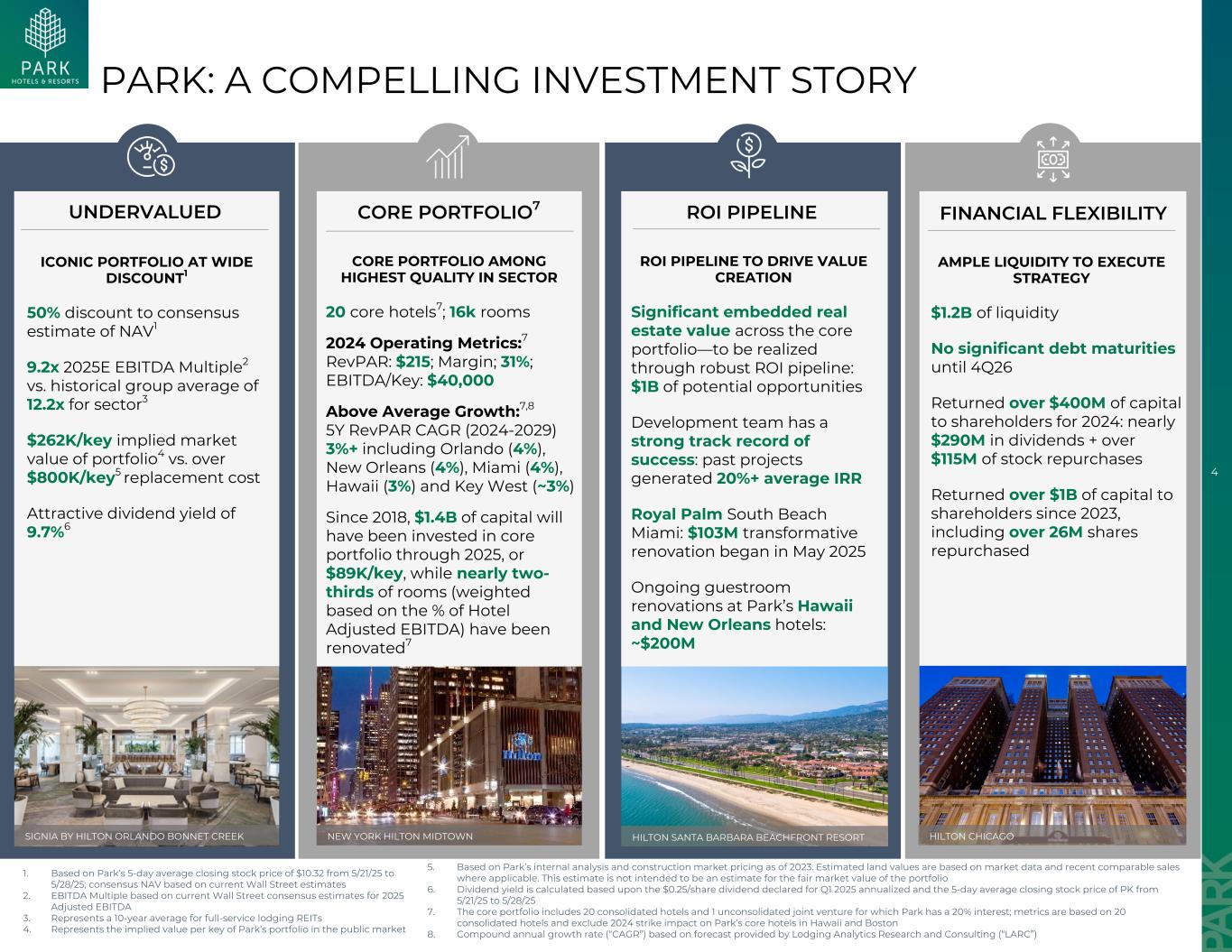 4 PARK:一个令人信服的投资故事低估了核心投资组合7金融灵活性ROI管道核心投资组合在行业ROI管道中的最高质量,以推动价值创造的标志性投资组合在广泛折扣1 AMPLE流动性以执行战略对NAV1的一致估计9.2x 2025E EBITDA Multiple2的50%折扣,而历史集团平均12.2x对于行业3投资组合的26.2万美元/关键隐含市值4与超过80万美元/关键5重置成本具有吸引力的股息收益率为9.7% 6核心投资组合的显着内含房地产价值——将通过稳健的ROI管道实现:10亿美元的潜在机会开发团队有着良好的成功记录:过去的项目产生了20% +的平均内部收益率迈阿密皇家棕榈南滩:2025年5月开始了1.03亿美元的变革性翻新公园夏威夷正在进行的客房翻新和新奥尔良酒店:~2亿美元20家核心酒店7;1.6万间客房2024年运营指标:7家RevPAR:215美元;利润率;31%;EBITDA/Key:40,000美元高于平均增长:7,8 5Y RevPAR CAGR(2024-2029)3% +包括奥兰多(4%)、新奥尔良(4%)、迈阿密(4%)、夏威夷(3%)和基韦斯特(~3%)自2018年以来,到2025年,将有1.4B美元的资本投资于核心投资组合,即8.9万美元/Key,虽然近三分之二的房间(根据酒店调整后EBITDA的百分比加权)已翻新7 $ 1.2B的流动性直到4Q26才有重大债务到期2024年向股东返还了超过4亿美元的资本:近2.9亿美元的股息+超过1.15亿美元的股票回购自2023年以来向股东返还了超过10亿美元的资本,其中包括回购的超过2600万股5。基于园区内部分析及截至2023年的建设市场定价。估计土地价值基于市场数据和适用的近期可比销售额。这一估计并不是对投资组合6的公平市场价值的估计。股息收益率是根据2025年第一季度宣布的0.25美元/股股息年化和5/21/25至5/28/257的PK 5天平均收盘股价计算得出的。核心投资组合包括20家合并酒店和1家未合并的合资企业,Park拥有20%的权益;指标基于20家合并酒店,不包括2024年罢工对Park在夏威夷和波士顿的核心酒店的影响8。基于Lodging Analytics Research and Consulting(“LARC”)提供的预测的复合年增长率(“CAGR”)1。基于Park在5/21/25至5/28/25期间的5天平均收盘价10.32美元;基于当前华尔街估计的共识NAV 2。EBITDA倍数基于当前华尔街对2025年调整后EBITDA的普遍预期3。代表全服务住宿REITs 4的10年平均值。代表Park在公开市场SIGNIA的投资组合的每密钥隐含价值by HILTON ORLANDO BONNET CREEEK NEW YORK HILTON MIDTOWN HILTON HILTON SANTA BARBARA BEACHFRONT Resort HILTON CHICAGO