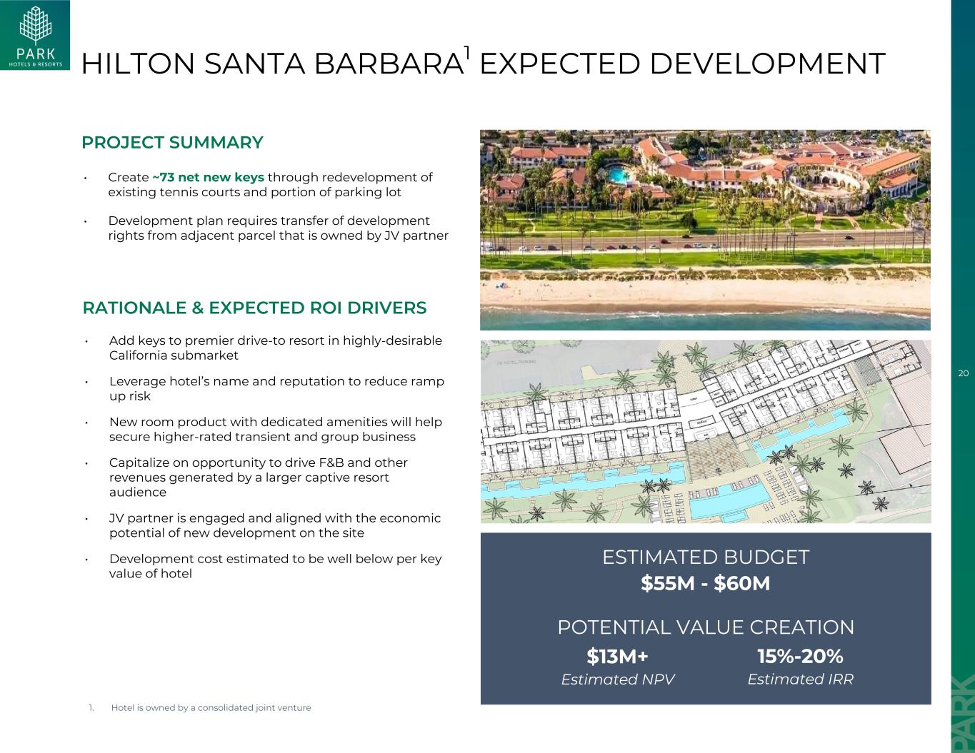 19 HILTON WAIKOLOA村预期发展•利用现有密度在现有停车场和网球场区域开发多达213个额外钥匙(酒店或分时度假)•公园可以开发额外的酒店钥匙或对多余的土地采取替代用途或货币化战略(例如,分时度假)•优化校园内未充分利用的空间•在进入市场的高门槛中创建额外的酒店钥匙,近年来该市场的RevPAR水平已达到创纪录的高水平•利用机会推动更多的专属度假村受众产生的餐饮和其他收入•提高翻新后的组合内的竞争力•在运营、管理和销售职能方面实现现有度假村和新塔之间的费用和劳动力协同效应•替代开发用途(例如,分时度假)可以以最低的资本支出提供额外的度假村需求•开发预计不会扰乱现有酒店,将在现有停车场和网球场区域项目上开发总结理由&预期投资回报率驱动因素潜在价值创造4500万美元+估计NPV 15%-20 %估计IRR估计预算2.25亿美元-2.50亿美元