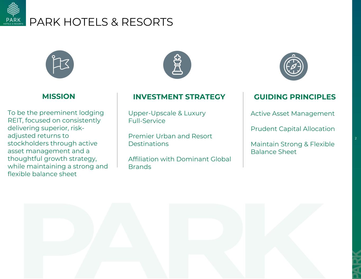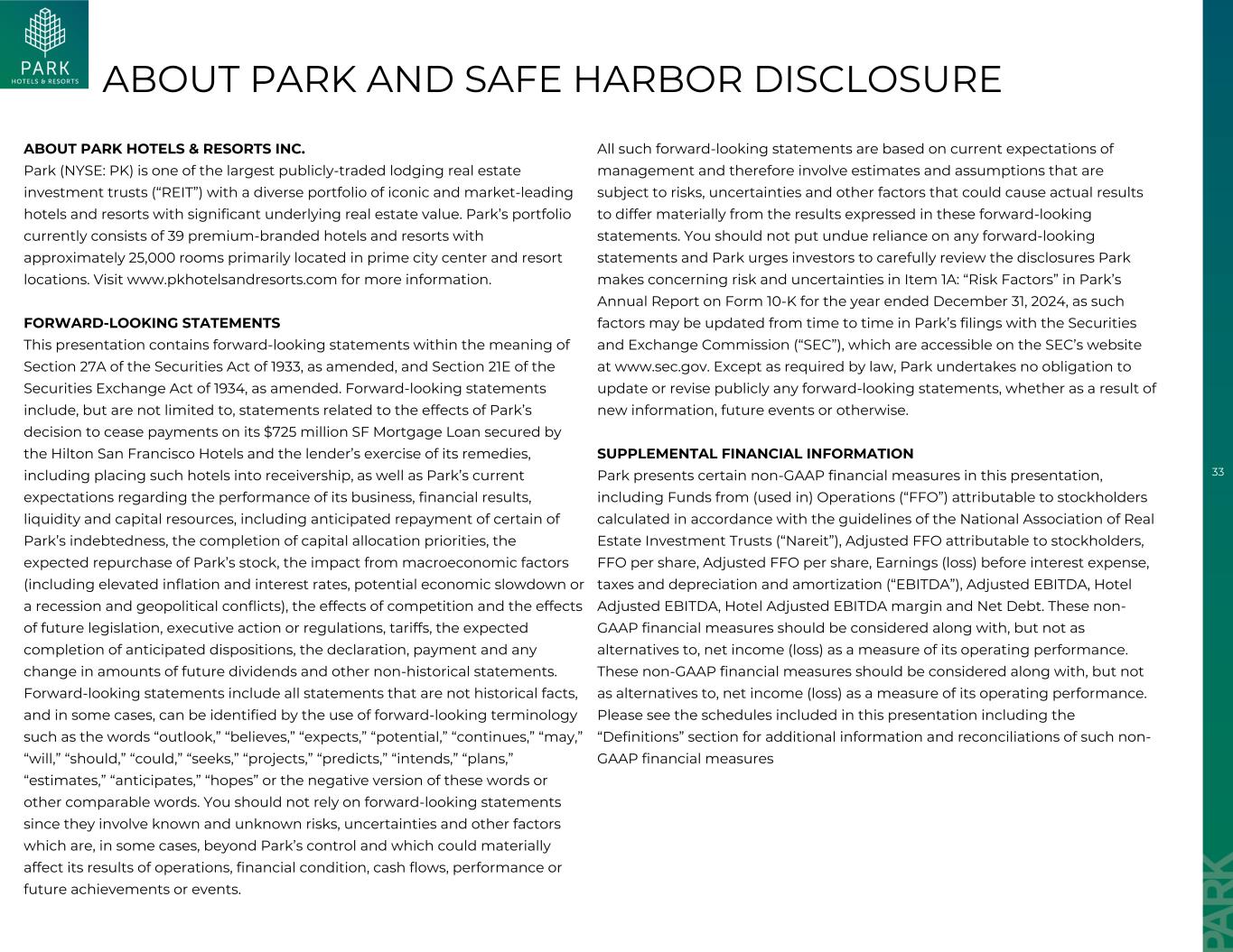 33关于Park和Safe Harbor披露关于Park Hotels & Resorts INC。Park(NYSE:PK)是最大的公开交易住宿房地产投资信托基金(“REIT”)之一,拥有多元化的标志性和市场领先的酒店和度假村投资组合,具有显着的潜在房地产价值。Park的投资组合目前包括39家高端品牌酒店和度假村,拥有约25,000间客房,主要位于市中心黄金地段和度假村位置。访问www.pkhotelsandresorts.com了解更多信息。前瞻性陈述本演示文稿包含经修订的1933年证券法第27A条和经修订的1934年证券交易法第21E条含义内的前瞻性陈述。前瞻性陈述包括但不限于与Park决定停止支付其由希尔顿旧金山酒店担保的7.25亿美元顺丰抵押贷款的影响以及贷方行使补救措施(包括将这些酒店置于接管状态)相关的陈述,以及Park目前对其业务表现、财务业绩、流动性和资本资源的预期,包括预期偿还Park的某些债务、资本分配优先事项的完成、预期回购Park的股票、宏观经济因素的影响(包括通胀和利率上升,潜在的经济放缓或衰退和地缘政治冲突)、竞争的影响以及未来立法、行政行动或法规、关税、预期完成预期处置、申报、支付以及未来股息金额的任何变化和其他非历史报表的影响。前瞻性陈述包括所有非历史事实的陈述,在某些情况下,可以通过使用前瞻性术语来识别,例如“展望”、“相信”、“预期”、“潜在”、“继续”、“可能”、“将”、“应该”、“可能”、“寻求”、“项目”、“预测”、“打算”、“计划”、“估计”、“预期”、“希望”或这些词的否定版本或其他类似词。您不应依赖前瞻性陈述,因为它们涉及已知和未知的风险、不确定性和其他因素,在某些情况下,这些因素超出了Park的控制范围,可能会对其经营业绩、财务状况、现金流、业绩或未来成就或事件产生重大影响。所有这些前瞻性陈述均基于管理层当前的预期,因此涉及受风险、不确定性和其他因素影响的估计和假设,这些因素可能导致实际结果与这些前瞻性陈述中表达的结果存在重大差异。您不应过分依赖任何前瞻性陈述,Park敦促投资者仔细审查Park在截至2024年12月31日止年度的10-K表格年度报告中就第1A项:“风险因素”中的风险和不确定性所做的披露,因为这些因素可能会在Park提交给美国证券交易委员会(“SEC”)的文件中不时更新,这些文件可在SEC网站www.sec.gov上查阅。除法律要求外,Park不承担公开更新或修改任何前瞻性陈述的义务,无论是由于新信息、未来事件或其他原因。补充财务信息Park在本演示文稿中提出了某些非公认会计准则财务指标,包括根据美国房地产投资信托协会(“Nareit”)的指导方针计算的归属于股东的(用于)运营的资金(“FFO”)、调整后的归属于股东的FFO、每股FFO、调整后的每股FFO、扣除利息费用、税项以及折旧和摊销前的收益(亏损)(“EBITDA”)、调整后的EBITDA、酒店调整后的EBITDA利润率和净债务。这些非GAAP财务指标应与净收入(亏损)一起考虑,但不应作为衡量其经营业绩的替代方案。这些非公认会计准则财务指标应与作为其经营业绩衡量标准的净收入(亏损)一起考虑,但不应作为其替代方案。请参阅本演示文稿中包含的时间表,包括“定义”部分,了解此类非公认会计原则财务措施的更多信息和调节