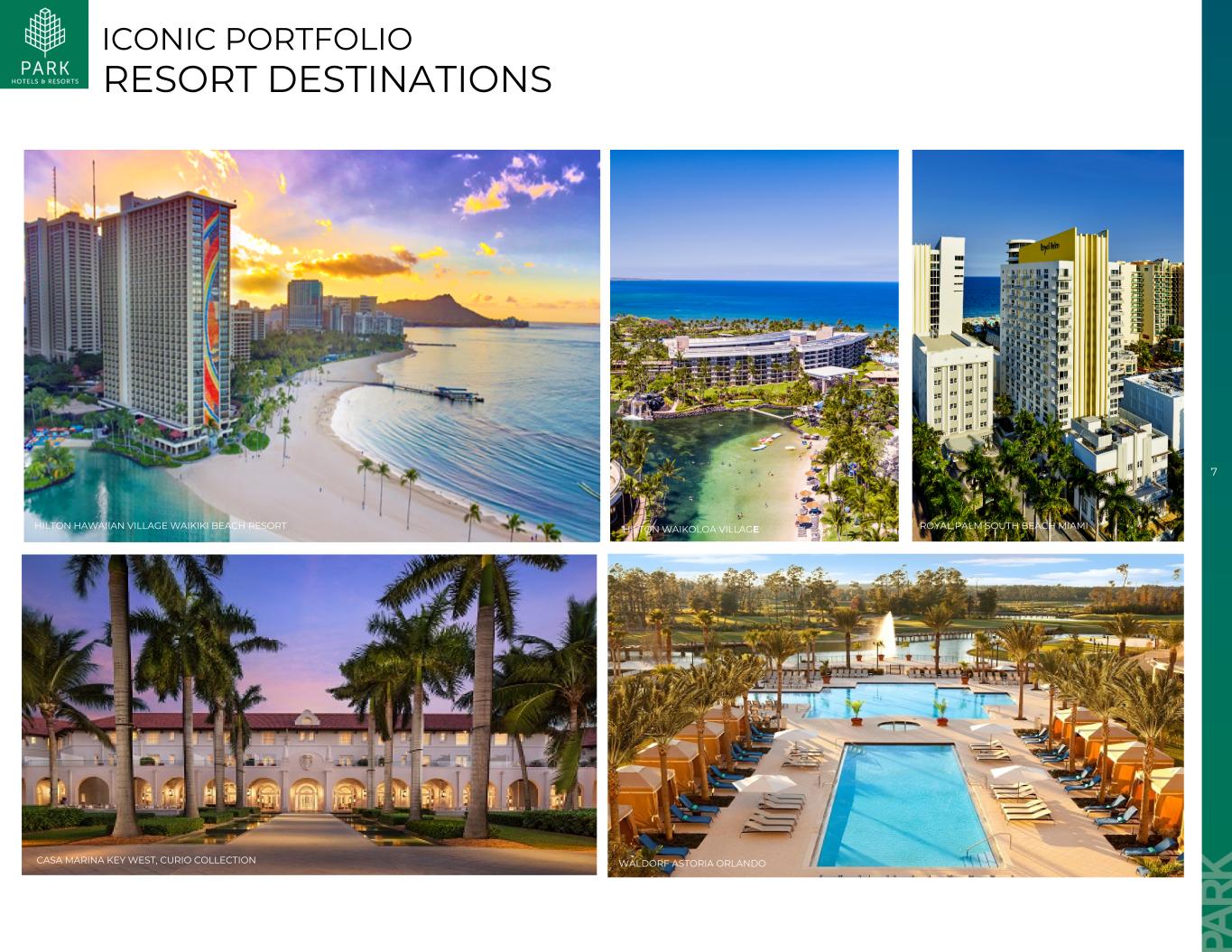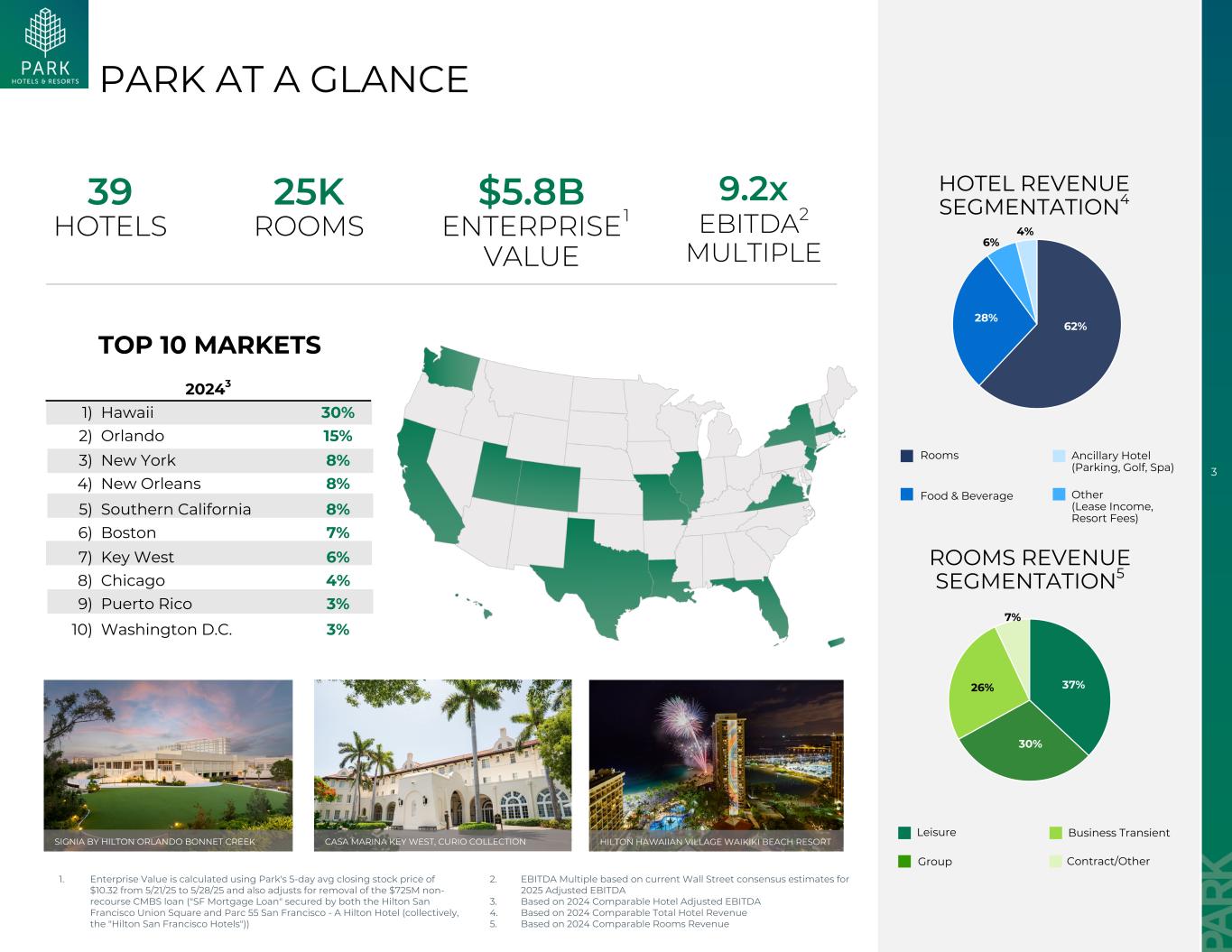 3202431)夏威夷30% 2)奥兰多15% 3)纽约8% 4)新奥尔良8% 5)南加州8% 6)波士顿7% 7)基韦斯特6% 8)芝加哥4% 9)波多黎各3% 10)华盛顿特区3%合同/其他休闲集团业务短暂公园一览无遗39家酒店25K客房$ 5.8B企业价值9.2x EBITDA 2多间客房收入分部5酒店收入分部4 2。EBITDA倍数基于当前华尔街对2025年调整后EBITDA的普遍预期3。基于2024年可比酒店调整后EBITDA 4。基于2024年可比酒店总收入5。基于2024年可比客房收入TOP10市场客房餐饮辅助酒店(停车场、高尔夫、水疗)其他(租赁收入、度假费)162% 28% 6% 4% 37% 26% 30% 7% 1。Enterprise Value是使用Park在5/21/25至5/28/25期间的5天平均收盘价10.32美元计算得出的,还会根据移除7.25亿美元的无追索权CMBS贷款(由旧金山联合广场希尔顿酒店和旧金山Parc 55-A希尔顿酒店(统称“希尔顿旧金山酒店”)担保的“顺丰抵押贷款”)进行调整SIGNIA BY HILTON ORLANDO BONNET CREEK CASA MARINA KEY WEST,CURIO COLLECTION HILTON HAWAIIAN Village WAIKIKI海滩度假村