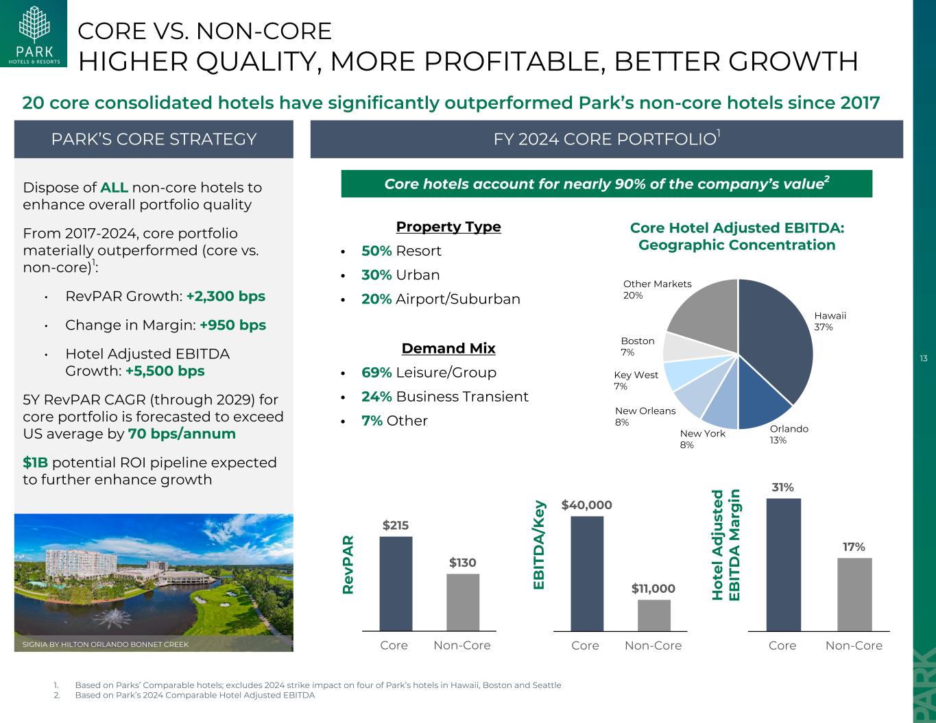 13家核心酒店占公司价值近90% 2 R EV P A R $ 215 $ 130核心非核心1。基于Parks的可比酒店;不包括2024年罢工对Park在夏威夷、波士顿和西雅图的四家酒店的影响2。基于Park 2024年可比酒店调整后EBITDA E B IT D A/KEY 40,000美元11,000美元核心非核心核心VS.非核心更高的质量,更有利可图,更好增长核心酒店调整后EBITDA:地理集中度夏威夷37%奥兰多13%纽约8%新奥尔良8%基韦斯特7%波士顿7%其他市场20% H ot el A d ju st ed e b it d a m ar g in 31% 17% 2024财年核心非核心PORTFOLIO1PARK的核心战略20核心合并酒店自2017年以来的表现明显优于Park的非核心酒店处置所有非核心酒店,以提高2017-2024年的整体投资组合质量,核心投资组合大幅跑赢(核心与非核心)1:• RevPAR增长:+ 2,300个基点•利润率变化:+ 950个基点•酒店调整后EBITDA增长:+ 5,500个基点核心投资组合的5年RevPAR复合年增长率(到2029年)预计将超过美国平均水平70个基点/年10亿美元的潜在ROI管道,预计将进一步提高增长SIGNIA by HILTON ORLANDO BONNET CREEK物业类型• 50%度假村• 30%城市• 20%机场/郊区需求组合•69%休闲/集团• 24%业务暂时性•7%其他