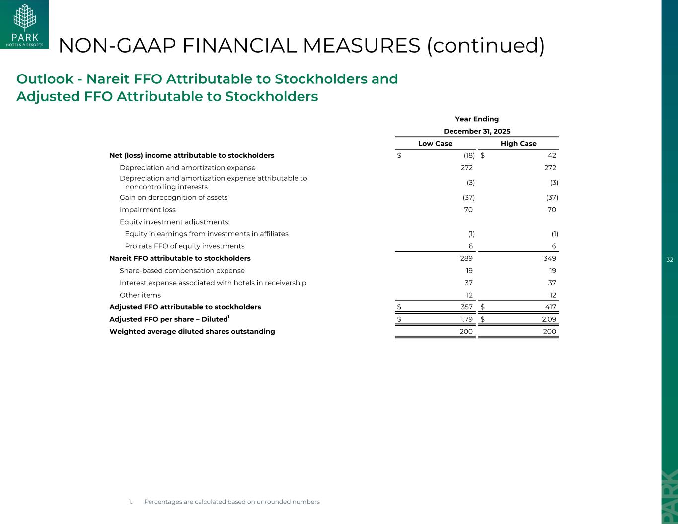 32项非公认会计准则财务措施(续)展望-截至12月31日的年度,归属于股东的Nareit FFO和归属于股东的调整后FFO,2025年Low Case High Case归属于股东的净(亏损)收入$(18)$ 42折旧和摊销费用272272折旧归属于非控制性权益的摊销费用(3)(3)终止确认资产的收益(37)(37)减值损失7070股权投资调整:附属公司投资收益中的权益(1)(1)股权投资的按比例FFO 66归属于股东的Nareit FFO 289349股权补偿费用1919与接管中的酒店相关的利息费用3737其他项目1212归属于股东的调整后FFO 357美元417美元调整后的FFO每股–稀释后1美元1.79美元2.09加权平均稀释后流通股20022001。百分比是根据未四舍五入的数字计算的