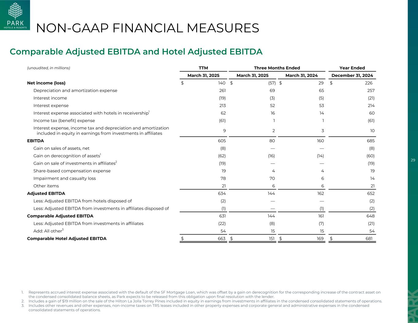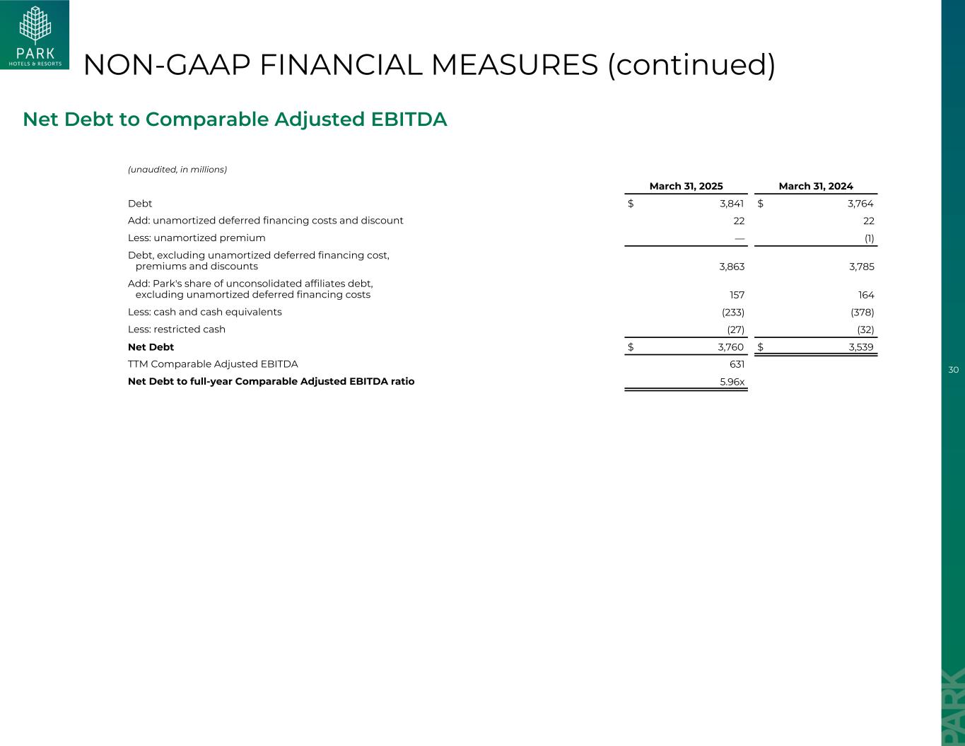 29非公认会计准则财务措施可比调整后EBITDA和酒店调整后EBITDA(未经审计,单位:百万)TTM截至2025年3月31日止三个月2025年3月31日2024年3月31日2024年12月31日净收入(亏损)$ 140 $(57)$ 29 $ 226折旧和摊销费用2616965257利息收入(19)(3)(5)(21)利息费用2135253214与接管中的酒店相关的利息费用16161460所得税(收益)费用(61)11(61)利息费用,对附属公司投资收益中计入权益的所得税和折旧及摊销92310 EBITDA 60580160685出售资产收益,净额(8)——(8)终止确认资产收益1(62)(16)(14)(60)出售附属公司投资收益2(19)——(19)以股份为基础的补偿费用194419减值和伤亡损失7870614其他项目216621调整后EBITDA 634144162652减:来自处置的酒店的调整后EBITDA(2)——(2)减:来自处置的关联公司投资的调整后EBITDA(1)——(1)(2)可比调整后EBITDA 631144161648减:来自对关联公司投资的调整后EBITDA(22)(8)(7)(21)加:所有其他354151554可比酒店调整后EBITDA 663美元151美元169美元6811。表示与顺丰抵押贷款违约相关的应计利息费用,该费用被简明综合资产负债表上合同资产相应增加的终止确认收益所抵消,因为Park预计将在与贷方的最终解决方案后解除该义务。2.包括出售Hilton La Jolla Torrey Pines的1900万美元收益,计入简明综合经营报表附属公司投资收益中的权益。3.包括其他收入及其他开支、计入其他物业开支的TRS租赁的非所得税以及简明综合经营报表中的公司一般及行政开支。