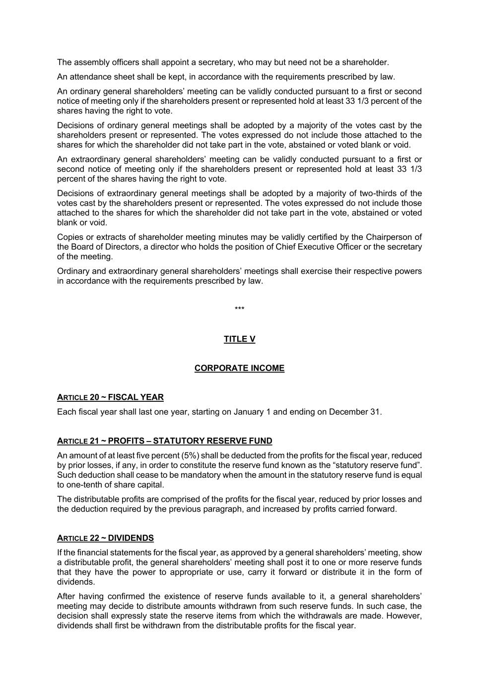 大会干事应任命一名秘书,该秘书可以但不必是股东。应当按照法律规定的要求,备存考勤表。普通股东大会只有在出席或代表的股东至少持有331/3%的有表决权股份的情况下,才能依据第一次或第二次会议通知有效进行。股东大会的决定应以出席或代表的股东所投票的过半数票通过。所表达的投票不包括该股东未参与投票、弃权或投空白票或作废的股份所附带的投票。临时股东大会只有在出席或代表的股东至少持有331/3%的有表决权股份的情况下,才能根据第一次或第二次会议通知有效进行。临时股东大会的决定应以出席或代表的股东所投票数的三分之二的多数票通过。所表达的投票不包括该股东未参与投票、弃权或投空白票或作废的股份所附带的投票。股东会议记录的副本或摘录,可由董事会主席、担任首席执行官职务的董事或会议秘书进行有效认证。股东大会、临时股东大会应当按照法律规定的要求行使各自的职权。***标题V公司收入第20条~财政年度每个会计年度应持续一年,自1月1日起,至12月31日止。第二十一条~利润——法定准备金至少百分之五(5%)的数额,应当从会计年度利润中扣除前期亏损(如有),以构成被称为“法定公积金”的准备金。当法定公积金中的金额等于股本的十分之一时,此种扣除不再是强制性的。可分配利润由会计年度利润减去前期亏损和前一段要求的扣除额,增加结转利润组成。第22条~股息股东大会批准的会计年度财务报表出现可分配利润的,股东大会应当将其转存到有权划拨或者使用的一项或者多项公积金中,结转或者以股利方式分配。股东大会在确认其可动用的备用资金存在后,可以决定分配从该备用资金中提取的金额。在这种情况下,应当在决定中明示退出的储备项目。但是,股息应首先从该会计年度的可分配利润中提取。