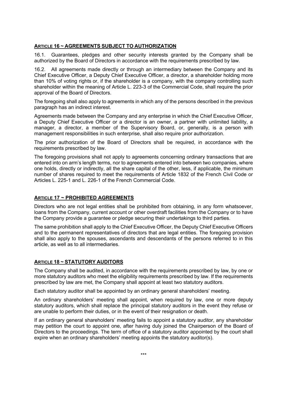 第16条~经授权的协议16.1。公司授予的担保、质押等担保权益,由董事会按照法律规定的要求授权。16.2.公司与其首席执行官、副首席执行官、董事、持有10%以上投票权的股东之间直接或通过中间人达成的所有协议,如果该股东是公司,则与《商法典》第L. 223-3条所指的公司控股该股东达成的所有协议,均需获得董事会的事先批准。上述规定也适用于上一款所述的任何人在其中拥有间接利益的协议。公司与首席执行官、副首席执行官或董事为所有者、无限责任合伙人、经理、董事、监事会成员,或一般为该企业中负有管理责任的人的任何企业之间订立的协议,也应要求事先授权。需董事会事先授权,按照法律规定的要求办理。上述规定不适用于按公平条件订立的有关普通交易的协议,也不适用于两家公司之间订立的协议,其中一方直接或间接持有另一方的全部股本,减去(如适用)满足《法国民法典》第1832条或《法国商法典》第L.225-1条和第L.226-1条要求所需的最低股份数量。第17条~禁止协议非法人的董事不得以任何形式从公司获得贷款、往来账户或公司的其他透支融资或让公司为其向第三方的承诺提供担保或质押。同样的禁令应适用于首席执行官、副首席执行官和作为法律实体的董事常驻代表。前述规定也适用于本条所指人员的配偶、上升亲属和后代,以及所有居间人。第十八条~法定审计师公司由符合法律规定资格条件的一名或多名法定审计师,按照法律规定的要求对公司进行审计。符合法律规定条件的,公司应当至少聘任两名法定审计师。每名法定审计师应由普通股东大会任命。普通股东大会应当在法律规定的情况下,指定一名或者多名法定副审计员,在其拒绝或者不能履行职责的情况下,或者在其辞职或者死亡的情况下,由其代替主要法定审计员。如普通股东大会未能委任法定核数师,任何股东在已妥为加入董事会主席的程序后,可向法院呈请委任一名法定核数师。法院指定的法定审计师任期自普通股东大会指定法定审计师时届满。***