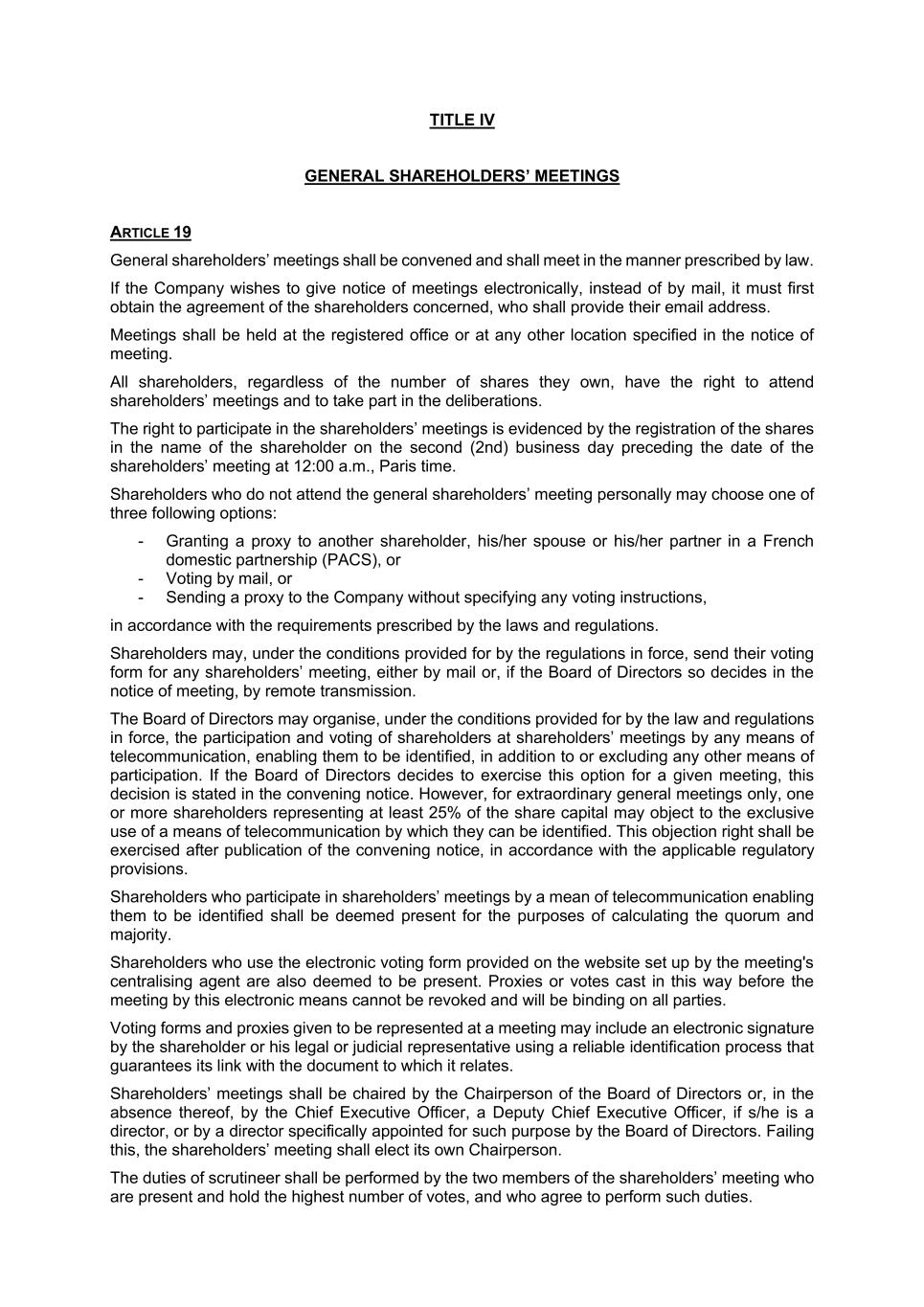 第四条股东大会第十九条股东大会的召开,应当按照法律规定的方式召开。公司如希望以电子方式而非邮寄方式发出会议通知,须先征得有关股东同意,有关股东应提供其电邮地址。会议应在注册办事处或会议通知中指明的任何其他地点举行。全体股东,无论拥有多少股份,均有权出席股东大会并参加审议。参加股东大会的权利以股东大会召开日期巴黎时间上午12时前第二(2)个营业日将股份登记在股东名下为凭证。未亲自出席股东大会的股东可选择以下三种方案之一:-根据法律法规规定的要求,向另一股东、其配偶或其在法国国内合伙企业(PACS)中的合伙人授予代理人,或-通过邮寄方式投票,或-向公司发送代理人而不指定任何投票指示。股东可以在现行规章规定的条件下,通过邮寄或者董事会在会议通知中有此决定的,通过远程传送的方式,发送参加任何股东大会的表决表。董事会可以在现行法律法规规定的条件下,除以其他方式参加或者不以其他方式参加外,以任何电信方式组织股东参加股东大会并参加表决,使其能够被识别。如果董事会决定对特定会议行使这一选择权,则在召集通知中说明这一决定。然而,仅就股东特别大会而言,代表至少25%股本的一名或多名股东可能会反对专门使用一种可以识别其身份的电信手段。本次异议权应在召集通知公布后,按照适用的监管规定行使。股东以电信方式参加股东大会,使其能够被识别的,在计算法定人数和过半数时,视为出席。使用会议集中代理机构设立的网站上提供的电子投票表格的股东,也视为出席。以这种电子方式在会前以这种方式投出的代理人或投票不能撤销,将对各方具有约束力。给予出席会议代表的投票表格和代理人可包括股东或其法定或司法代表使用可靠的身份识别程序进行的电子签名,以保证其与所涉及的文件的链接。股东大会应由董事会主席主持,如主席缺席,则由首席执行官、副首席执行官(如其为董事)主持,或由董事会为此目的专门任命的董事主持。未通过的,由股东大会选举自己的主席。监票人的职责由出席并持有最高票数的两名股东大会成员履行,并同意履行该职责。