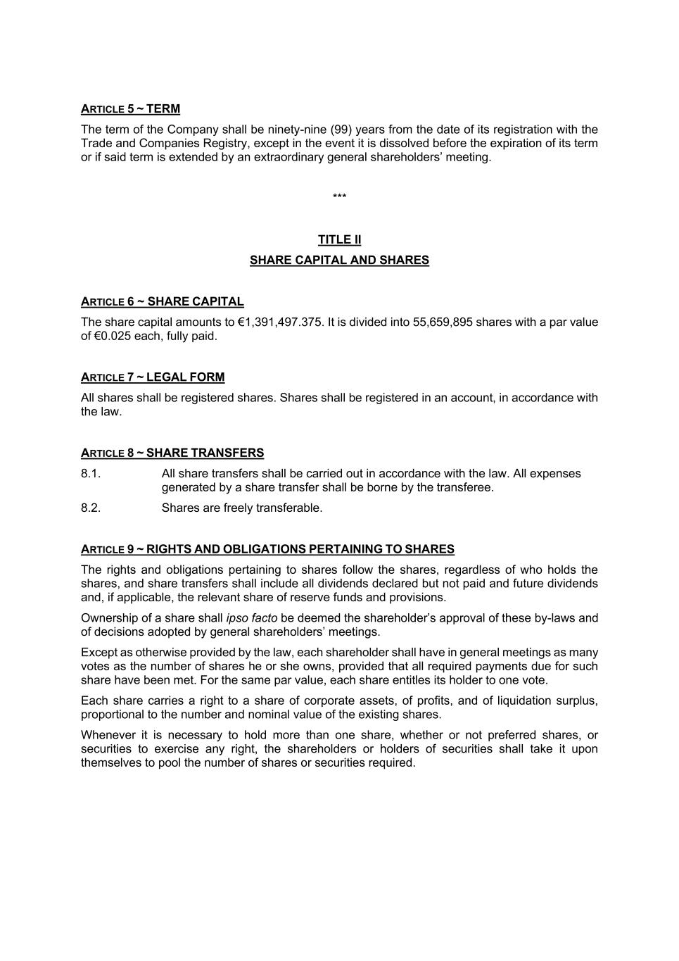 第五条~任期公司的任期为自其在贸易和公司注册处登记之日起九十九(99)年,但在其任期届满前解散或经临时股东大会延长上述任期的情况除外。***Title II share capital and shares Article 6~share capital股本为1,391,497.375欧元。它分为55,659,895股,每股面值0.025欧元,已缴足。第七条~法律形式所有股份均为记名股份。股登记入户,依法办理。第8条~股份转让8.1。所有股份转让均应依法进行。股份转让产生的一切费用由受让方承担。8.2.股份可自由转让。第九条~与股份有关的权利和义务与股份有关的权利和义务跟随股份,无论股份由谁持有,股份转让应包括所有已宣布但未支付的股息和未来的股息以及(如适用)相关的公积金份额和准备金。股份所有权应被视为股东对本章程和股东大会通过的决定的认可。除法律另有规定外,每位股东在股东大会上应拥有与其所拥有的股份数量一样多的投票权,但前提是该股份应支付的所有必要款项已得到满足。对于相同的面值,每一股股票赋予其持有人一票的权利。每一股都有权分享公司资产、利润和清算盈余,与现有股份的数量和面值成正比。凡需要持有一股以上股份,不论是否优先股,或证券行使任何权利,股东或证券持有人应自行承担汇集所需的股份或证券数量。