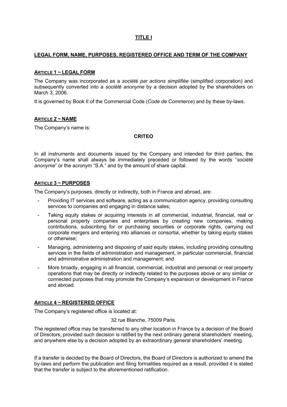 Title i Legal Form,Name,Purposes,Registered Office and Term of the Company Article 1~Legal Form The Company was formed as a soci é t é par actions simplifi é e(simplified corporation)and then converted into a soci é t é anonyme by a decision approved by the shareholders on March 3,2006。其受《商法典》(Code de Commerce)第二册及本附例规管。第2条~名称公司名称为:CRITEO在公司发行的所有拟面向第三方的文书和文件中,公司名称的前后应始终紧接“soci é t é anonyme”或首字母缩写“S.A.”等字样,并以股本金额为单位。第3条~宗旨公司在法国和国外直接或间接的目的是:-提供IT服务和软件,充当传播机构,向公司提供咨询服务并从事远程销售;-通过创建新公司、出资、认购或购买证券或公司权利、进行公司合并和建立联盟或财团,无论是通过参股还是其他方式,取得所有商业、工业、金融、不动产或个人财产公司和企业的股权或获得权益;-管理、管理和处置上述股权,包括提供行政和管理领域的咨询服务,特别是商业、财务和行政行政和管理;-更广泛地说,从事可能与上述目的直接或间接相关的所有金融、商业、工业和个人或不动产业务或可能促进公司在法国和国外扩张或发展的任何类似或相关目的。第4条~注册办事处本公司的注册办事处位于:32 rue Blanche,75009 Paris。注册办事处可根据董事会的决定转移到法国的任何其他地点,但该决定须经下一次普通股东大会批准,并经特别股东大会通过的决定在其他任何地方批准。如果转让是由董事会决定的,则授权董事会修改章程,并履行因此而需要的公布和备案手续,前提是说明转让须经上述批准。