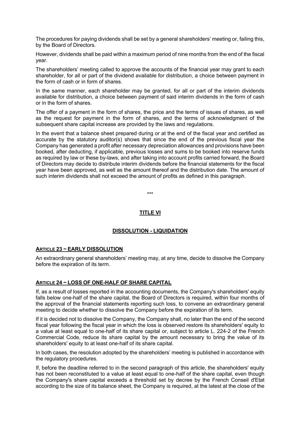 分红的程序由股东大会确定,未通过的由董事会确定。然而,股息应在会计年度结束后的最长九个月内支付。为批准财政年度账目而召开的股东大会,可就可供分配的全部或部分股息,向每位股东授予以现金或股份形式支付的选择权。以同样方式,就可供分配的全部或部分中期股息而言,每个股东可获授予以现金或股份形式支付所述中期股息之间的选择权。以股份形式支付的要约、发行股份的价格和条款,以及以股份形式支付的请求,以及后续转增股本的确认条款由法律法规规定。如果在会计年度期间或期末编制并经法定审计师认证为准确的资产负债表显示,自上一会计年度结束以来,公司产生了经必要的折旧准备和备抵入账后的利润,在扣除(如适用)法律或本细则要求的先前损失和将计入储备基金的款项后,并在考虑结转利润后,董事会可在该会计年度的财务报表获得批准之前决定派发中期股息,以及派发金额和派发日期。该等中期股息的金额不得超过本款所界定的利润金额。***第六条解散-清算第二十三条~提前解散临时股东大会可以随时决定在公司任期届满前解散公司。第二十四条~损失一半股本如果由于会计文件列报的亏损,公司股东权益低于股本的二分之一,则要求董事会在报告该亏损的财务报表获得批准后的四个月内,召开临时股东大会,决定是否在任期届满前解散公司。如果决定不解散公司,公司应不迟于出现亏损的会计年度的第二个会计年度结束时,将其股东权益恢复到至少等于其股本的二分之一的价值,或在符合法国商法典第L. 224-2条的情况下,将其股本减少必要的数量,以使其股东权益的价值至少达到其股本的二分之一。在这两种情况下,股东大会通过的决议都是按照监管程序发布的。如在本条第二款所指的截止日期前,股东权益仍未重组至至少等于股本二分之一的价值,即使公司股本超过法国国家行政管理委员会根据其资产负债表规模的法令规定的门槛,要求公司最迟于