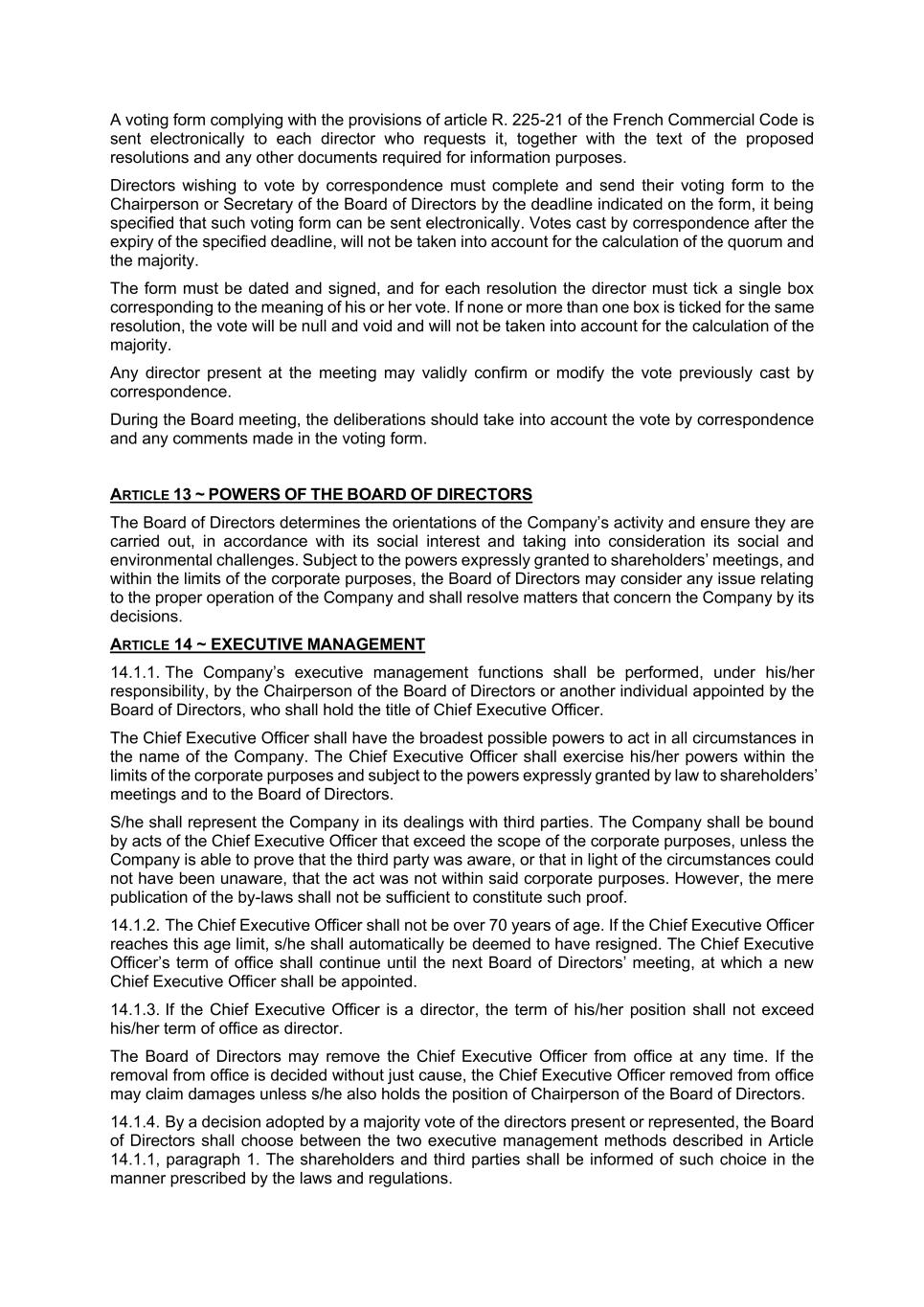 将以电子方式向提出要求的每位董事发送一份符合《法国商法典》第R.225-21条规定的投票表格,连同提议的决议文本和为提供信息所需的任何其他文件。希望以通讯方式投票的董事必须在表格上注明的截止日期前填写并将其表决表发送给董事长或董事会秘书,具体规定该表决表可以电子方式发送。在规定期限届满后以通讯方式投出的票,在计算法定人数和过半数时不予考虑。表格必须注明日期和签名,对于每项决议,董事必须在与其投票含义相对应的单个框中打勾。同一决议如无人或多于一个方框被打勾,则投票无效,将不计入过半数的计算。任何出席会议的董事均可对此前以通讯方式投出的票进行有效确认或修改。在董事会会议期间,审议应考虑到以通讯方式进行的投票以及在投票表格中提出的任何意见。第13条~董事会的权力董事会根据其社会利益并考虑其社会和环境挑战,确定公司活动的方向并确保这些活动得以开展。在符合股东大会明示授予的权力的情况下,并在公司宗旨的范围内,董事会可考虑与公司的适当运作有关的任何问题,并应通过其决定解决与公司有关的事项。第14条~行政管理14.1.1。公司的执行管理职能由董事会主席或董事会任命的其他个人履行,由其负责,其拥有首席执行官的头衔。首席执行官应拥有以公司名义在所有情况下采取行动的尽可能广泛的权力。首席执行官应在公司宗旨范围内行使其权力,并受法律明确授予股东大会和董事会的权力的约束。S/he应代表公司与第三方进行交易。公司须受首席执行官超出公司宗旨范围的行为的约束,除非公司能够证明第三方知悉,或根据情况不可能不知悉,该行为不在所述公司宗旨范围内。然而,仅公布附例并不足以构成该等证明。14.1.2.首席执行官的年龄不得超过70岁。如果首席执行官达到这一年龄限制,s/he将自动被视为已辞职。首席执行官的任期应延续至下一次董事会会议,届时应任命新的首席执行官。14.1.3.首席执行官为董事的,其任职期限不超过其董事任期。董事会可随时解除首席执行官的职务。如果无正当理由决定免职,被免职的首席执行官可以要求赔偿损失,除非她/她还担任董事会主席一职。14.1.4.董事会由出席或代表的董事以多数票通过的决定,在第14.1.1条第1款所述的两种执行管理方式之间作出选择。应当按照法律法规规定的方式告知股东和第三方。