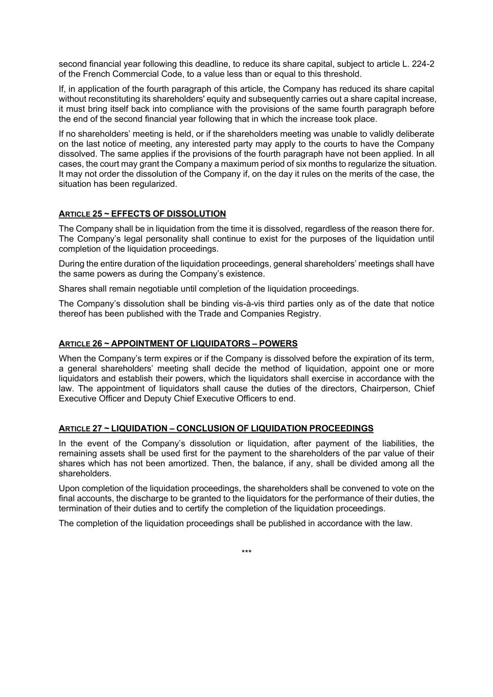 在此截止日期后的第二个财政年度,根据法国《商法典》第L.224-2条的规定,将其股本减少至低于或等于这一阈值的价值。如适用本条第四款规定,公司在不重组其股东权益的情况下减少了股本并随后进行了股本增加,则必须在增加发生后的第二个财政年度结束前使其自身恢复遵守同一第四款的规定。未召开股东大会的,或者股东大会无法对最后一次会议通知进行有效审议的,任何利害关系人可以向法院申请公司解散。未适用第四款规定的,同样适用。在所有情况下,法院可能会授予公司最长六个月的时间来使情况正常化。如果在其就案情作出裁决之日,情况已正常化,则不得下令解散该公司。第二十五条~解散的影响公司自解散之时起即处于清算状态,无论其存在何种原因。为清算之目的,公司的法人资格应继续存在,直至清算程序结束。在清算程序的整个存续期内,股东大会享有与公司存续期间相同的权力。股份应保持可转让状态,直至清算程序完成。公司的解散仅在其通知已在贸易和公司注册处公布之日起对第三方具有约束力。第二十六条~清算人的任命——公司任期届满时的权力或者公司在任期届满前解散的,应当由股东大会决定清算方式,指定一名或者多名清算人并确立其权力,由清算人依法行使。清盘人的委任须导致董事、主席、行政总裁及副行政总裁的职责终止。第二十七条~清算——公司发生解散或者清算时清算程序的终结,在偿付负债后,应先将剩余资产用于向股东支付其尚未摊销的股份面值。然后,余额如有,由全体股东平分。清算程序完成后,应召集股东就决算、拟授予清算人履行职责的解除义务、终止其职责和证明清算程序完成进行表决。清算程序完成情况应当依法予以公布。***
