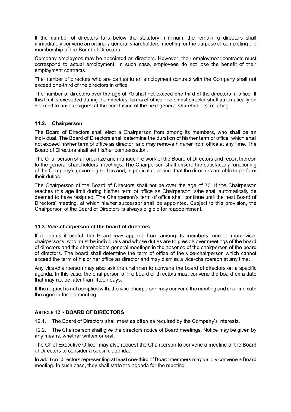 董事人数低于法定最低人数的,其余董事应立即召开普通股东大会,以完成董事会成员资格。公司雇员可获委任为董事。但是,他们的就业合同必须与实际就业相对应。在这种情况下,雇员不会失去其雇佣合同的好处。与公司订立聘用合同当事人的董事人数不得超过在任董事的三分之一。70岁以上董事人数不得超过在任董事的三分之一。如果在董事任期内超过这一限制,则在下一次股东大会结束时,年龄最大的董事自动视为已辞职。11.2.主席董事会应从其成员中选举一名主席,由个人担任。董事会应当确定其任期,不得超过其董事任期,并可以随时免去其职务。董事会应确定其薪酬。董事长应当组织管理董事会的工作,并向股东大会报告工作。主席应确保公司理事机构的运作令人满意,特别是确保董事能够履行其职责。董事会主席年龄不得超过70岁。主席在担任主席期间达到这一年龄限制的,自动视为辞职。主席的任期应延续至下一次董事会会议,届时应任命其继任者。在符合这一规定的情况下,董事会主席始终有资格获得连任。11.3.董事会副董事长认为有用的,董事会可以从其成员中委派一名或多名副董事长,副董事长必须是个人,其职责是在董事长缺席的情况下主持董事会会议和股东大会。董事会应当确定副董事长的任期,不得超过其董事职务的任期,可以随时解聘一名副董事长。任何副董事长也可以要求董事长召开特定议程的董事会。在这种情况下,董事会主席必须在不迟于十五天的日期召开董事会。请求未得到遵守的,副主持人可以召集会议,并应当注明会议议程。第12条~董事会12.1。董事会应根据公司利益的需要经常开会。12.2.董事长应向董事发出董事会会议通知。可以通过任何方式发出通知,无论是书面通知还是口头通知。首席执行官还可要求主席召开董事会会议,审议特定议程。此外,代表至少三分之一董事会成员的董事可有效召集董事会会议。在这种情况下,他们应说明会议议程。