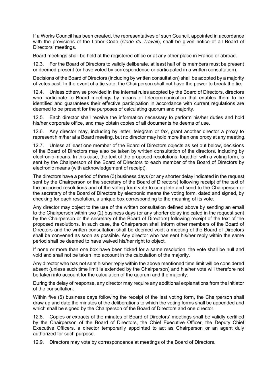 如果已经成立了工务委员会,根据《劳动法》(Code du Travail)的规定任命的该委员会的代表应收到所有董事会会议的通知。董事会会议应在注册办事处或法国或国外任何其他地点举行。12.3.董事会要进行有效审议,必须至少有半数成员出席或视同出席(或曾以通讯方式投票或参加书面协商)。董事会的决定(包括书面协商)应以过半数票通过。如果出现票数相同的情况,主席无权打破平局。12.4.除非董事会通过的内部规则另有规定,为计算法定人数和多数,通过电信方式参加董事会会议的董事如能被识别并保证其按照现行法规有效参与,则视为出席。12.5.每名董事应收到履行其职责和担任其公司职务所需的信息,并可获得其认为使用的所有文件的副本。12.6.任何董事均可(包括以信函、电报或传真)授予另一名董事代表出席董事会会议,但任何董事不得在任何会议上担任一名以上的代表。12.7.除非至少有一名董事会成员提出如下反对,董事会的决定也可以通过与董事书面协商的方式作出,包括通过电子方式作出。在这种情况下,提议的决议文本连同一份表决表由董事会主席以电子方式发送给董事会的每位成员(附收货确认书)。董事在收到提议的决议和表决表投票文本后有三(3)个工作日(或主席或董事会秘书发出的请求中指明的任何较短延迟)的期限,以完成并通过电子方式向主席或董事会秘书发送注明日期和签名的表决表,方法是为每项决议勾选一个与其投票含义相对应的唯一框。任何董事可在收到提议的决议文本后的两(2)个工作日内(或主席或董事会秘书发出的请求中指明的任何较短延迟),通过向主席发送电子邮件,反对使用上述定义的书面协商。在这种情况下,董事长应通知董事会其他成员,书面协商视为无效;应尽快召开董事会会议。凡在同一期限内已发送回函的董事,视为放弃其异议权。同一决议未打勾或超过一个方框的,该表决无效,不得在计算过半数时予以考虑。任何董事如未在上述时限内发出答覆,将被视为缺席(除非主席延长该时限),因此在计算法定人数和多数票时将不考虑其投票。在延迟回复期间,任何董事可要求谘询发起者作出任何补充解释。主席应在收到最后一份表决表后的五(5)个工作日内,拟定表决记录并注明日期,表决表附后并由董事会主席和一名董事签署。12.8.董事会会议记录的副本或摘录应由董事会主席、首席执行官、副首席执行官、临时委任代行主席职务的董事或为此目的正式授权的代理人有效认证。12.9.董事可以在董事会会议上以通讯方式进行表决。