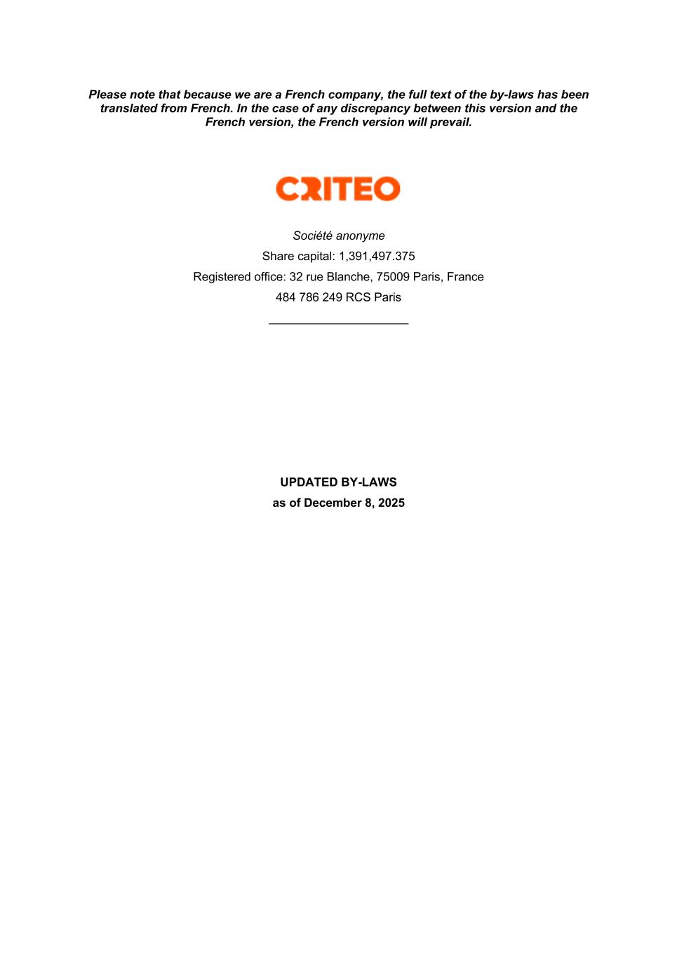 请注意,由于我们是一家法国公司,章程全文已由法文翻译而来。本版与法版如有不一致,以法版为准。Soci é t é anonyme股本:1,391,497.375注册办事处:32 rue Blanche,75009 Paris,France 484786249 RCS Paris ______________________截至2025年12月8日已更新的附例