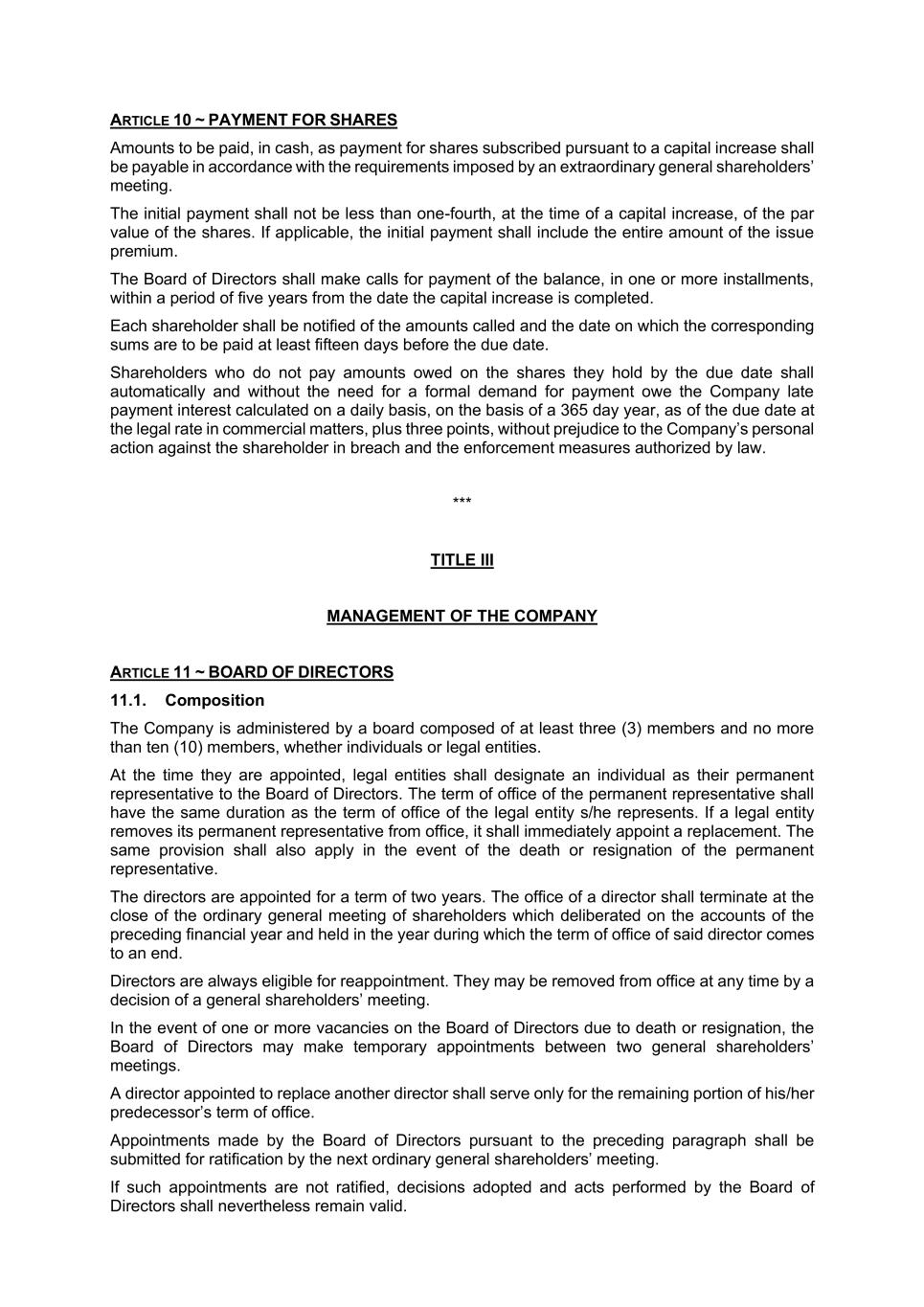 第10条~以现金支付的股份支付金额,作为根据增资认购的股份的支付,应按照临时股东大会规定的要求支付。首期缴款不低于增资时股份面值的四分之一。如适用,首期付款应包括发行溢价的全部金额。董事会应在增资完成之日起五年内,分一次或多次催缴余款。应在到期日前至少十五天通知每一股东催缴的金额和相应款项的支付日期。未按到期日支付所持股份所欠款项的股东,应自动且无需正式要求付款,欠公司按日计算的逾期付款利息,以365天为基础,按到期日按商业事项上的法定利率,加三分,但不影响公司对违约股东的个人诉讼和法律授权的强制执行措施。***标题三公司管理第11条~董事会第11.1条。组成公司由至少三(3)名成员和不超过十(10)名成员组成的董事会管理,无论是个人还是法人。在任命时,法律实体应指定一名个人为其常驻董事会代表。常驻代表的任期与她/他所代表的法律实体的任期相同。法律实体解除其常驻代表职务的,应当立即任命一名接替人员。同样的规定也应适用于常驻代表去世或辞职的情况。董事任期两年。董事任期自该董事任期届满当年召开的审议上一财政年度决算的股东大会结束时终止。董事始终有资格获得连任。股东大会的决定,可以随时将其免职。因死亡或辞职导致董事会出现一个或多个空缺时,董事会可在两次股东大会之间临时聘任。获委任接替另一名董事的董事,任期仅限于其前任任期的剩余部分。董事会依据前款作出的任命,应提交下次普通股东大会批准。如果这些任命没有得到批准,董事会通过的决定和履行的行为仍然有效。