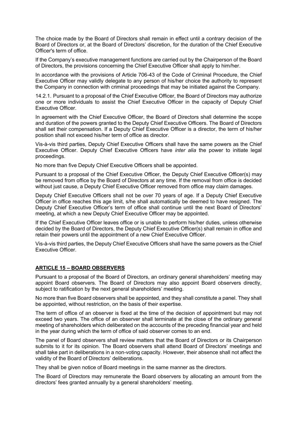 董事会作出的选择应一直有效,直至董事会作出相反的决定,或由董事会酌情决定,在首席执行官的任期内。公司执行管理职能由董事会主席履行的,有关首席执行官的规定适用于他/她。根据《刑事诉讼法典》第706-43条的规定,首席执行官可有效地向其选择的任何人授予在可能对公司提起的刑事诉讼中代表公司的权力。14.2.1.根据首席执行官的提议,董事会可授权一名或多名个人以副首席执行官的身份协助首席执行官。董事会应与首席执行官达成协议,确定授予副首席执行官的权力范围和期限。董事会应确定其薪酬。副首席执行官为董事的,其任职期限不超过其董事任期。相对于第三方,副首席执行官应拥有与首席执行官相同的权力。副首席执行官除其他外拥有提起法律诉讼的权力。聘任副首席执行官不超过五人。根据首席执行官的提议,副首席执行官可随时被董事会免职。如果无正当理由决定免职,被免职的副首席执行官可以要求赔偿损失。副首席执行官年龄不得超过70岁。如果在任的副首席执行官达到这一年龄限制,她/他将自动被视为已辞职。副首席执行官的任期应延续至下一次董事会会议,届时可任命新的副首席执行官。如首席执行官离任或无法履行职责,除非董事会另有决定,副首席执行官应继续留任并保留其权力,直至任命新的首席执行官。相对于第三方,副首席执行官应拥有与首席执行官相同的权力。第15条–董事会观察员根据董事会的提议,普通股东大会可以任命董事会观察员。董事会还可直接任命董事会观察员,但须经下一次股东大会批准。任命的董事会观察员不得超过五名,并组成一个小组。应根据他们的专长,不受限制地任命他们。观察员的任期在决定任命时确定,但不得超过两年。观察员职务自该观察员任期届满当年召开的审议上一财政年度决算的普通股东大会结束时终止。董事会观察员小组应对董事会或其主席提交其征求意见的事项进行审查。董事会观察员应当出席董事会会议,并以列席身份参加审议。但其缺席不影响董事会审议的有效性。应以与董事相同的方式向他们发出董事会会议通知。董事会可通过从股东大会每年授予的董事费用中拨出一笔款项,向董事会观察员支付报酬。