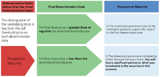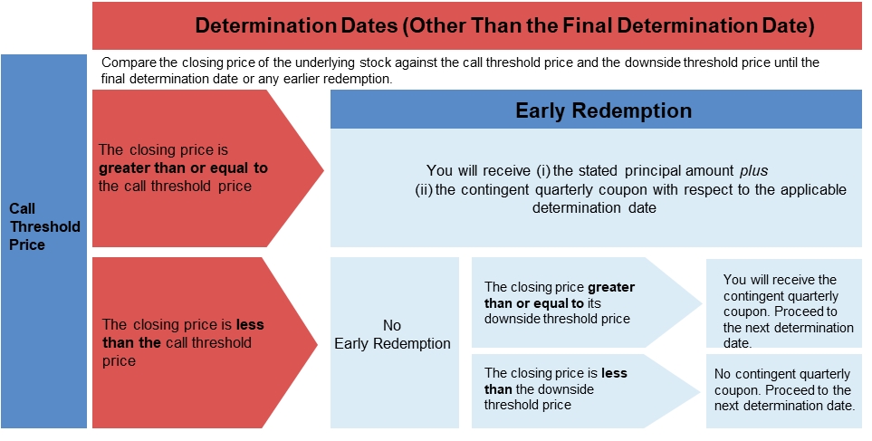 如果最终确定日以外的任何确定日标的股票的收盘价大于或等于赎回阀值价格,则该证券将自动赎回,赎回金额等于紧接相关确定日之后的第一个或有息票支付日的提前赎回付款。 一旦赎回证券,将不会再支付任何款项。