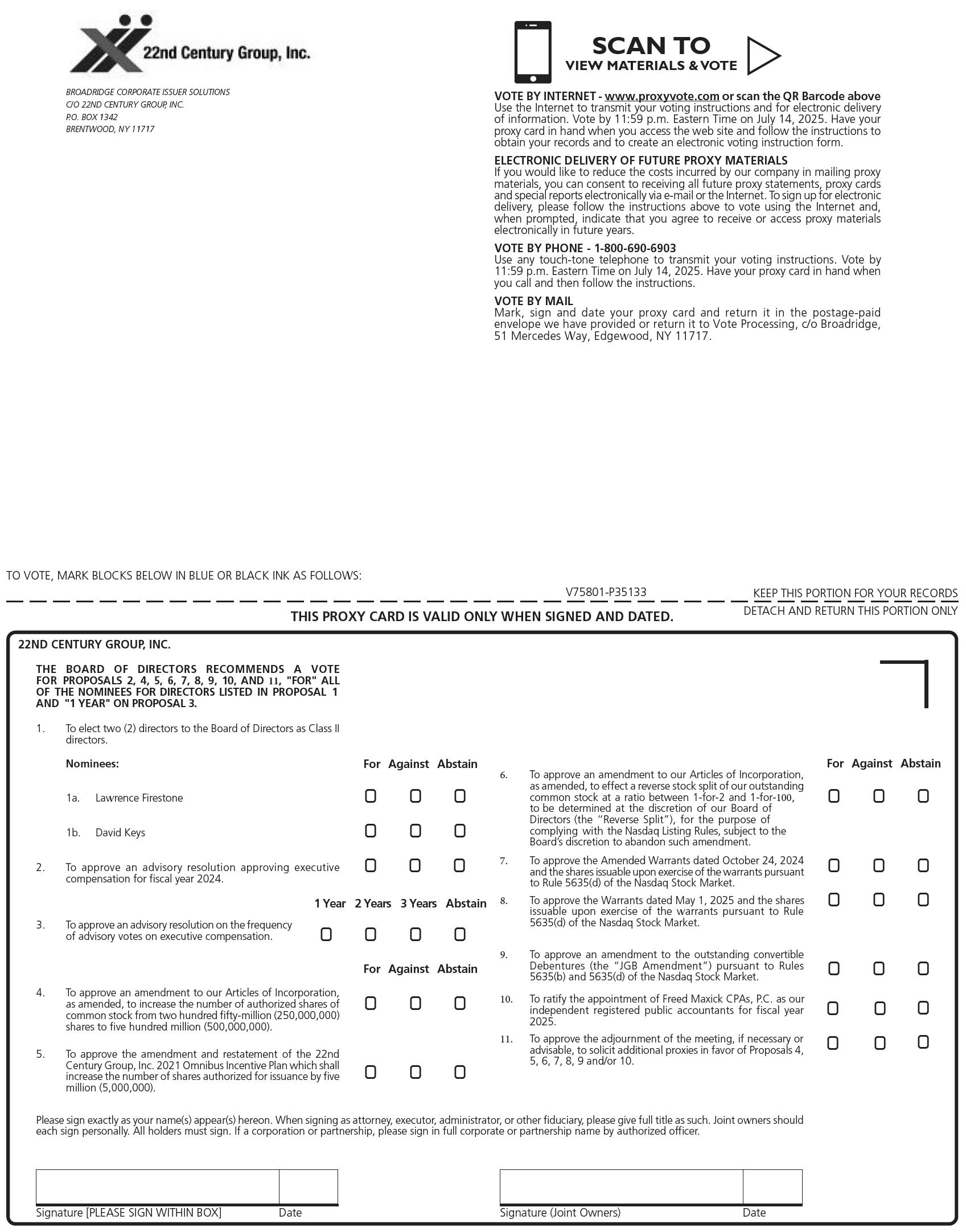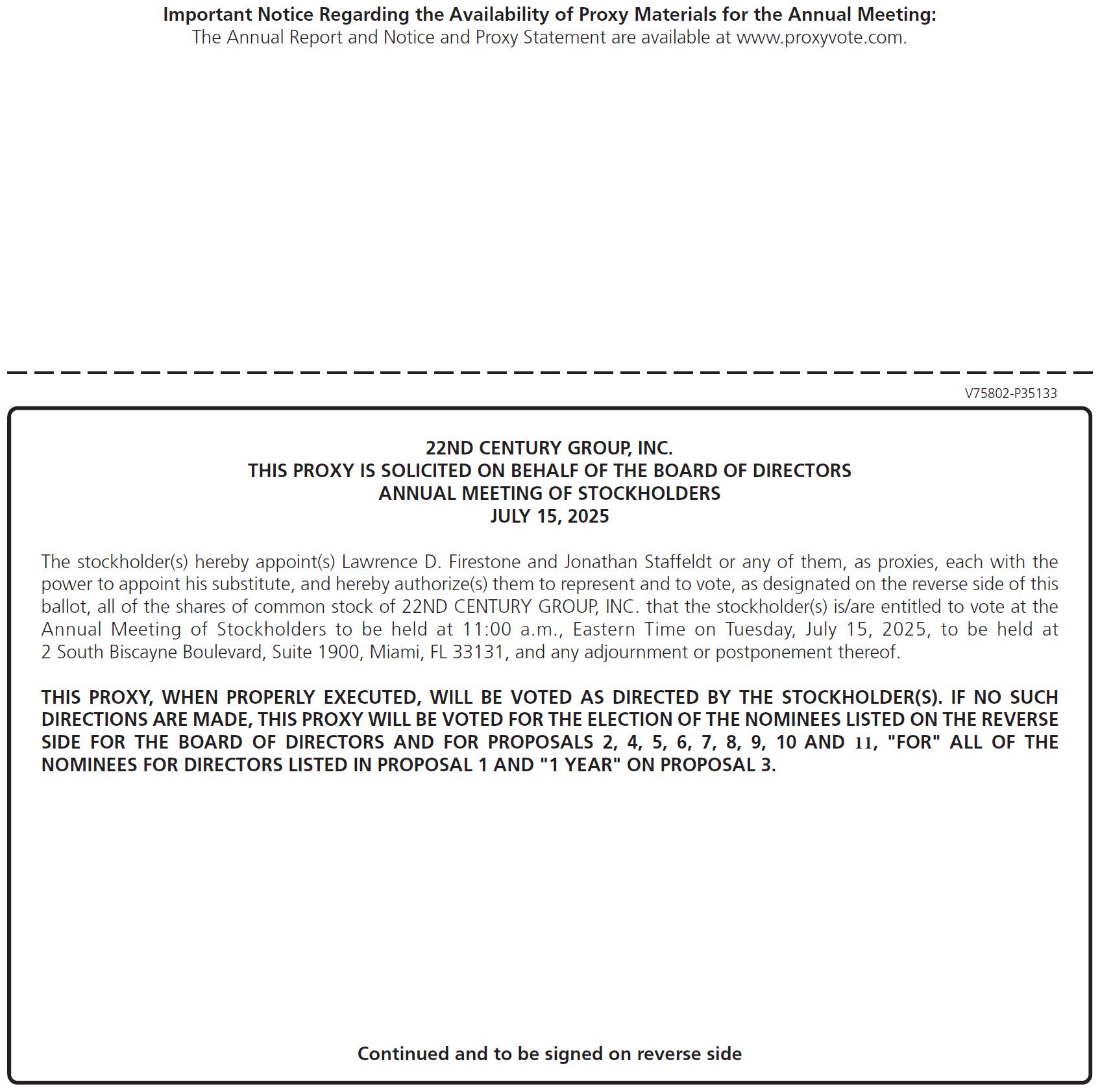 请注意,22nd Century Group, Inc.(“公司”)股东年会将于美国东部时间2025年7月15日(星期二)上午11:00开始,地点为2 South Biscayne Boulevard,Suite 1900,Miami,FL 33131。