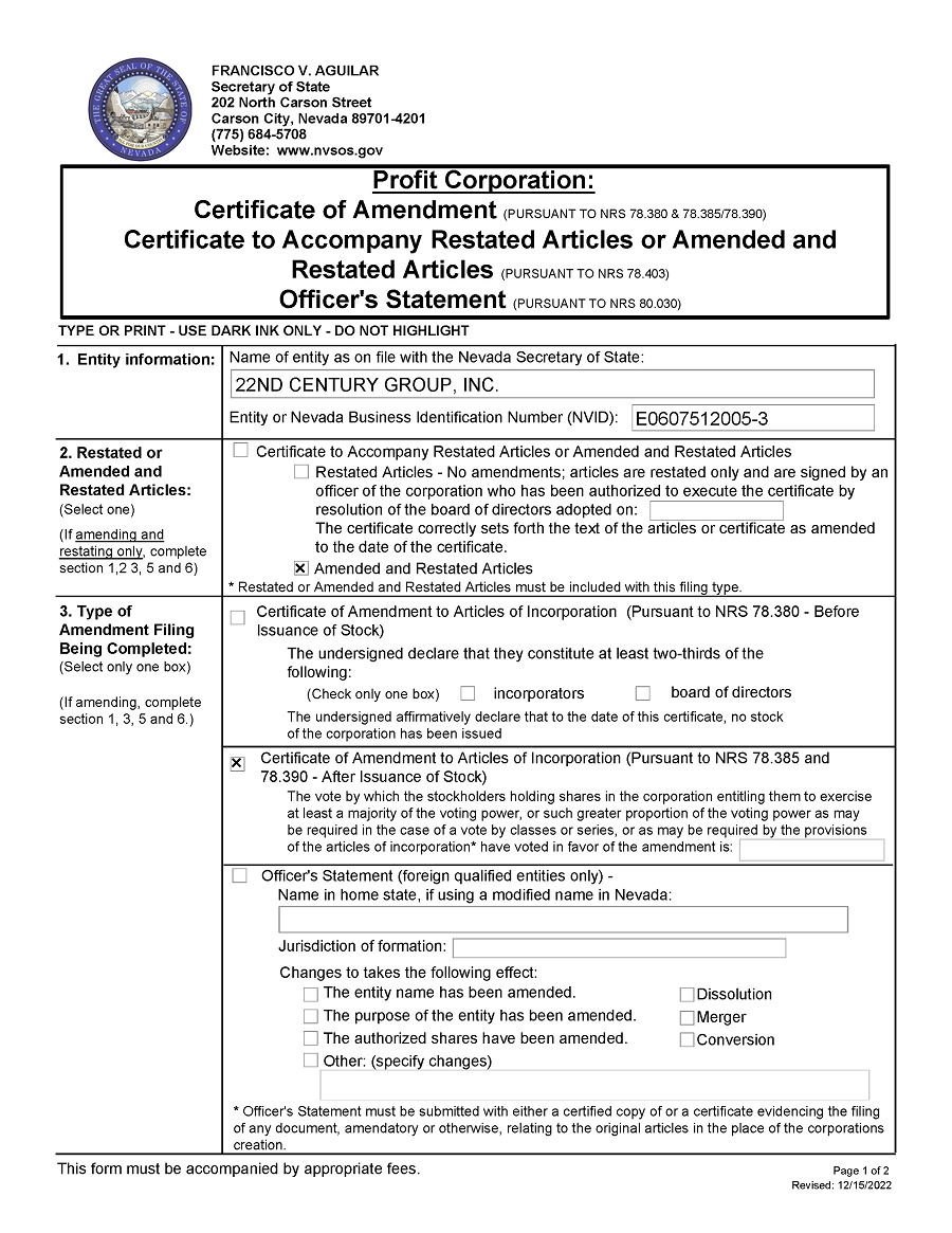 根据NRS78.2055的要求,22nd Century Group, Inc.(“公司”)董事会提出并向股东建议,在不对每股面值进行任何调整且不减少普通股授权股数的情况下,以1换[ ]的方式减少公司已发行在外普通股的数量,每股面值0.00001美元,该提议获得持有公司股份的股东的批准,使他们有权行使至少过半数的投票权,或在按类别或系列投票的情况下可能需要的更大比例的投票权,或公司章程条文另有规定的投票权。