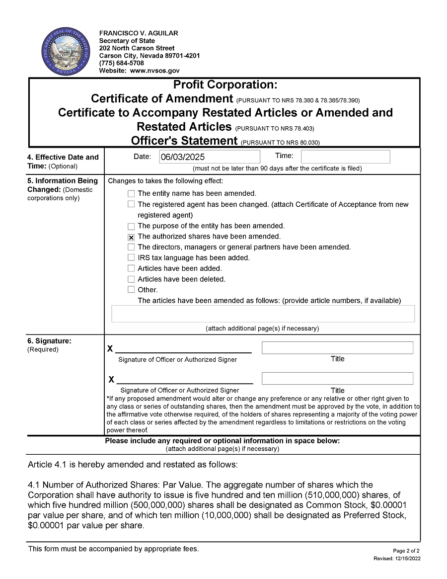 “在根据NRS第78章修订重述的公司章程的备案生效(“生效时间”)后,在紧接生效时间之前已发行和流通的公司普通股的每[ ]股股份应自动重新分类并合并为公司普通股的一(1)股有效发行、已缴足且不可评估的股份,公司或其持有人无需采取任何进一步行动,但须按下文所述的零碎股份权益处理(“反向股票分割”)。公司不得因反向股票分割而向任何持有人发行零碎普通股。[相反,因此类变更而产生的任何普通股零碎份额应向上四舍五入到最接近的普通股整数份额。因四舍五入而发行的股份权益仅为节省发行普通股零碎股份的费用和不便而给予,并不代表为对价而单独议价。] [公司应代替该零碎股份,向持有人支付一笔现金,金额等于该零碎股份乘以生效时间前最后一个交易日(为实施反向股票分割而调整)在纳斯达克资本市场报告的普通股收盘销售价格。]直至交出,紧接生效时间之前代表普通股股份的每份证书(“旧证书”)应仅代表因反向股票分割而将以前由该旧证书代表的普通股股份合并为的普通股整股股份的数量。”