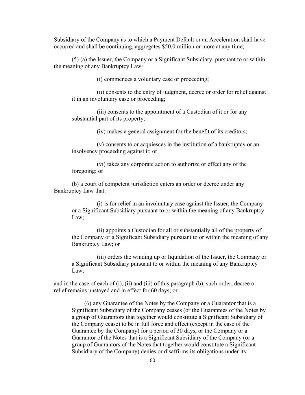 60公司的附属公司,其付款违约或加速应已发生并应继续进行,在任何时候合计5000万美元或更多;(5)(a)发行人、公司或重要附属公司,根据或在任何破产法的含义内:(i)启动自愿案件或程序;(ii)同意进入判决,在非自愿案件或程序中对其作出救济的判令或命令;(iii)同意委任其保管人或其财产的任何实质部分;(iv)为其债权人的利益作出一般转让;(v)同意或默许对其提起破产或破产程序;或(vi)采取任何公司行动以授权或实施上述任何规定;或(b)有管辖权的法院根据任何破产法作出命令或判令,认为:(i)是根据或在任何破产法的含义范围内针对发行人、公司或重要附属公司的非自愿案件中的救济;(ii)根据或在任何破产法的含义范围内为公司或重要附属公司的全部或基本全部财产指定托管人;或(iii)根据或在任何破产法的含义范围内命令发行人、公司或重要附属公司清盘或清算;而就本款(b)项(i)、(ii)及(iii)中的每一项而言,该等命令,判令或救济在60天内仍未停止和有效;或(6)公司或作为公司重要附属公司的担保人对票据的任何担保终止(或一组担保人对票据的担保将共同构成公司的重要附属公司终止)在30天内完全有效和有效(公司担保的情况除外),或公司或作为公司重要附属公司的票据的担保人(或票据的一组担保人,合共将构成公司的重要附属公司)否认或否认其在其