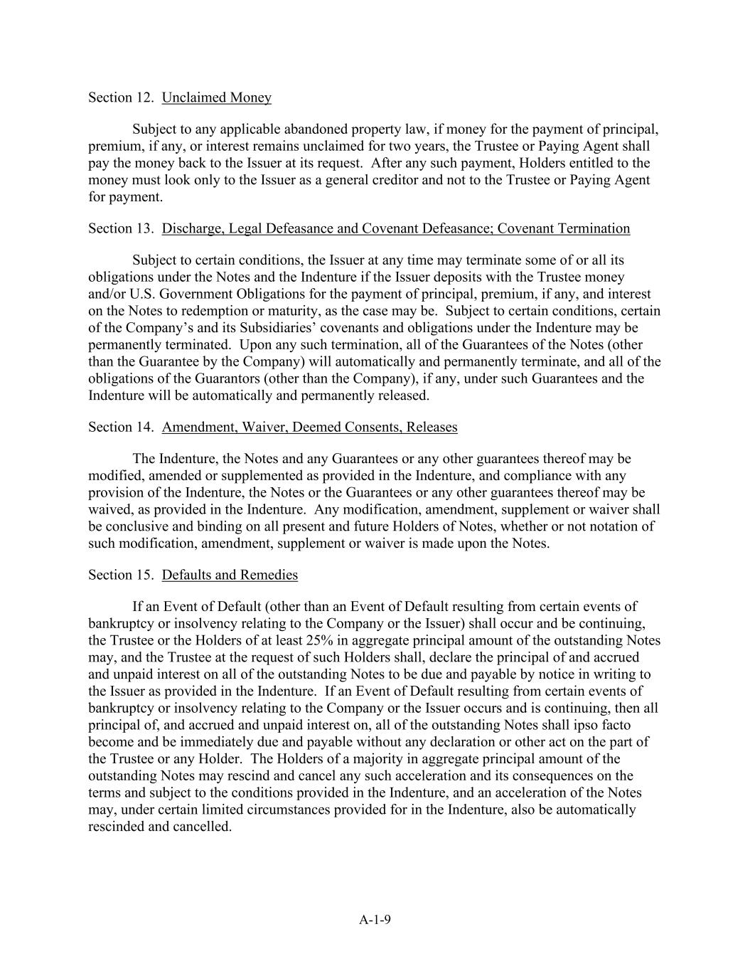 A-1-9第12节。无人认领的款项在符合任何适用的废弃物权法的情况下,用于支付本金、溢价(如有)或利息的款项两年内仍无人认领的,受托人或付款代理人应其请求将款项偿还给发行人。在任何此类付款后,有权获得款项的持有人必须仅将发行人视为一般债权人,而不是受托人或付款代理人。第13节。解除、法律失效和契约失效;契约终止在符合某些条件的情况下,发行人可随时终止其在票据和义齿下的部分或全部义务,前提是发行人向受托人存入款项和/或美国政府的义务,以支付票据的本金、溢价(如有)和利息至赎回或到期(视情况而定)。根据某些条件,公司及其子公司在契约下的某些契诺和义务可能被永久终止。于任何该等终止后,票据的所有担保(公司担保除外)将自动永久终止,而担保人(公司除外)在该等担保及契约项下的所有义务(如有的话)将自动永久解除。第14节。修订、豁免、视为同意、解除契约、票据及其任何担保或任何其他担保可按契约规定进行修改、修订或补充,并可按契约规定放弃遵守契约、票据或其担保或其任何其他担保的任何规定。任何修改、修订、补充或放弃,均为结论性的,并对所有现在和未来的票据持有人具有约束力,无论是否在票据上作出该等修改、修订、补充或放弃。第15节。违约及补救如果违约事件(与公司或发行人有关的某些破产或无力偿债事件导致的违约事件除外)发生并仍在继续,则受托人或未偿票据本金总额至少25%的持有人可,而受托人应该等持有人的要求,应根据义齿的规定,以书面通知方式向发行人宣布所有未偿票据的本金以及应计和未付利息到期应付。如果与公司或发行人有关的某些破产或资不抵债事件导致的违约事件发生并仍在继续,则所有未偿票据的所有本金、应计和未付利息均应理所当然地成为并立即到期应付,而无需受托人或任何持有人作出任何声明或其他行为。持有未偿还票据本金总额多数的持有人可根据义齿中规定的条款和条件撤销和取消任何此类加速及其后果,并且在义齿中规定的某些有限情况下,票据的加速也可自动撤销和取消。