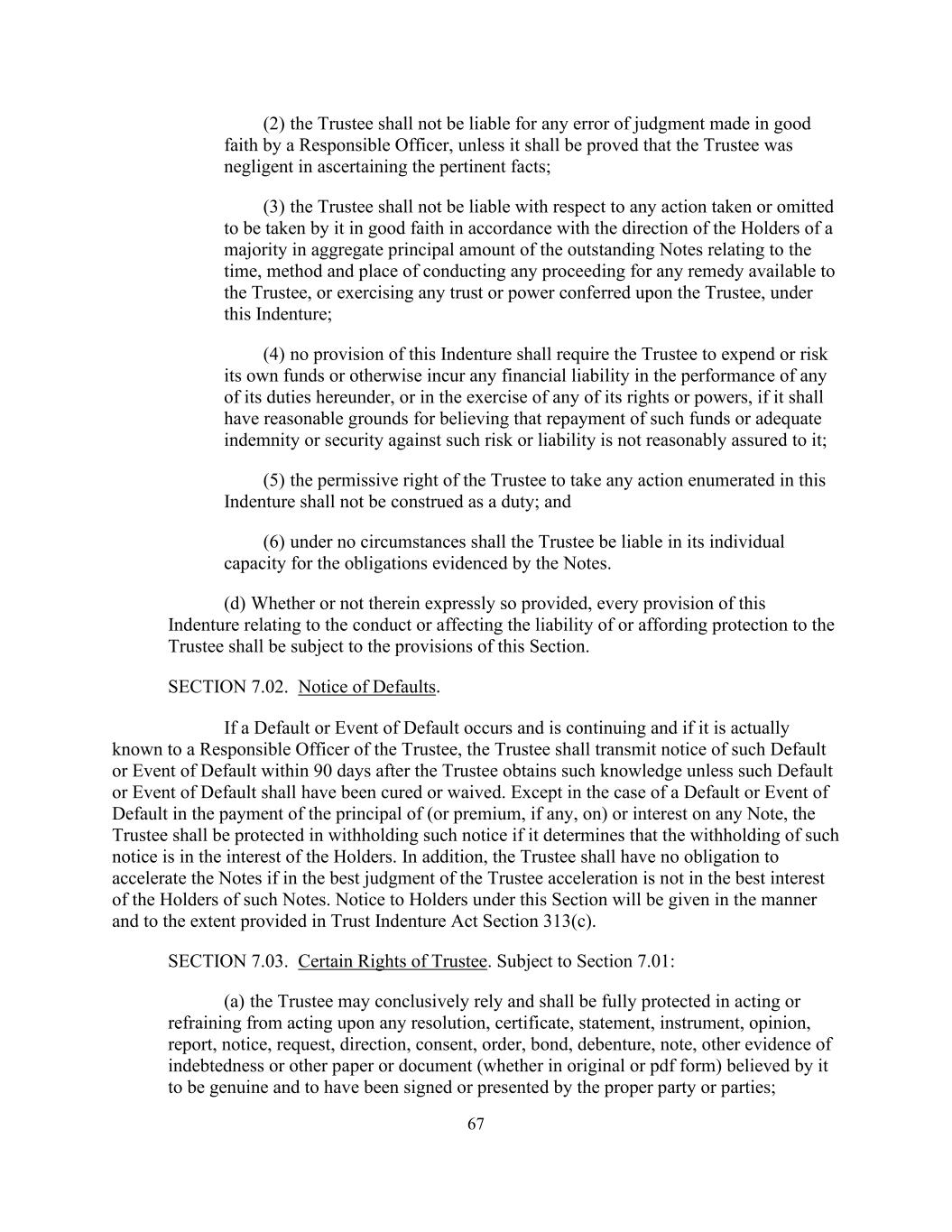 67(2)受托人无须就负责人员善意作出的任何判断错误承担法律责任,除非证明受托人在确定有关事实方面有疏忽;(3)受托人无须就其按照未偿还票据本金总额过半数的持有人的指示而善意采取或不采取的任何行动承担法律责任,而该等行动与进行任何法律程序的时间、方法及地点有关,以获得受托人可利用的任何补救,或行使根据本契约授予受托人的任何信托或权力;(4)本契约的任何条文不得要求受托人在履行其根据本契约承担的任何职责或在行使其任何权利或权力时支出或承担自有资金风险或以其他方式承担任何财务责任,如其有合理理由相信偿付该等资金或针对该等风险或责任的足够弥偿或担保并没有合理地向其保证;(5)受托人采取本契约所列举的任何行动的允许权不应被解释为一种义务;及(6)在任何情况下,受托人均不得以个人身份对票据所证明的义务承担责任。(d)不论其中是否明文如此规定,本指引中有关受托人的行为或影响受托人的法律责任或向受托人提供保护的每项条文,均须受本条条文规限。第7.02节。违约通知。如果违约或违约事件发生并仍在继续,并且如果受托人的负责人员实际知道该违约或违约事件,则受托人应在受托人获得该等知情后的90天内传送该违约或违约事件的通知,除非该违约或违约事件已得到纠正或豁免。除任何票据的本金(或溢价,如有的话)或利息的支付发生违约或违约事件外,如果受托人确定扣留该通知符合持有人的利益,则在扣留该通知时应受到保护。此外,如果根据受托人的最佳判断加速不符合此类票据持有人的最佳利益,则受托人没有义务加速票据。将按照《信托契约法》第313(c)条规定的方式和范围,根据本条向持有人发出通知。第7.03节。受托人的某些权利。除第7.01条另有规定外:(a)受托人在根据任何决议、证明书、陈述书、文书、意见、报告、通知、要求、指示、同意、命令、债券、债权证、票据、其他债务证据或其认为真实并已由适当一方或多方签署或出示的其他纸张或文件(不论是原件或pdf形式)行事或不行事时,可确凿地依赖并应受到充分保护;