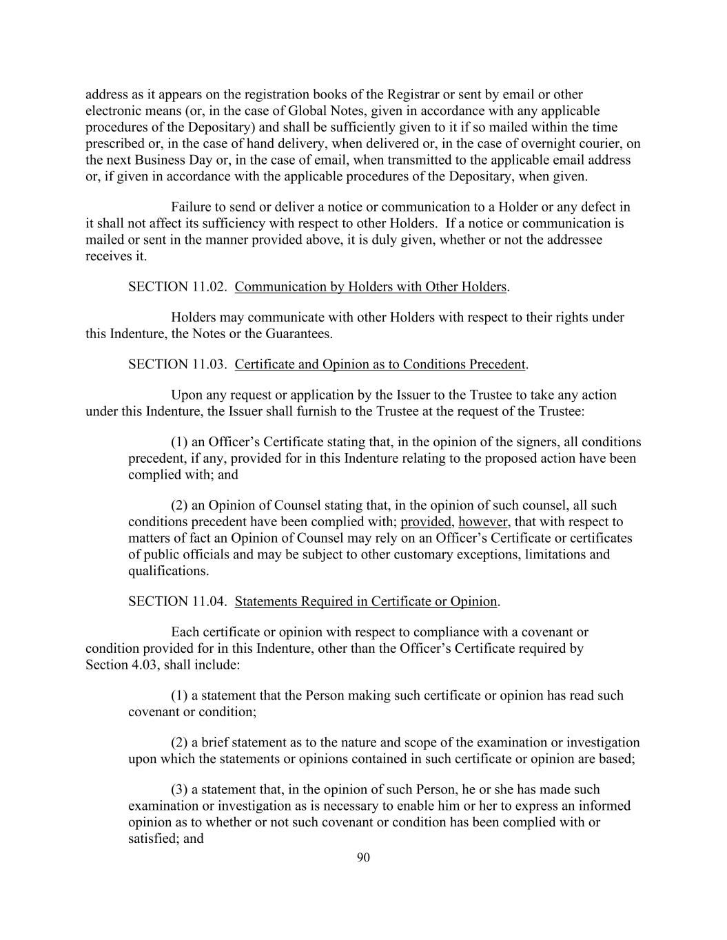 在书记官长登记簿上出现或以电子邮件或其他电子方式发送(或在全球票据的情况下,按照保存人的任何适用程序提供)的90个地址,如果在规定的时间内如此邮寄,或在专人递送的情况下,在交付时,或在隔夜快递的情况下,在下一个工作日,或在电子邮件的情况下,在传送到适用的电子邮件地址时,或在按照保存人的适用程序提供时,应充分提供给它。未向持有人发送或交付通知或通信或其中的任何缺陷,不影响其相对于其他持有人的充分性。如果以上述规定的方式邮寄或发送通知或通信,则无论收件人是否收到,该通知或通信均已妥为发出。第11.02节。持有人与其他持有人的沟通。持有人可就其在本契约、票据或担保项下的权利与其他持有人进行沟通。第11.03节。关于条件先决条件的证明和意见。在发行人向受托人提出根据本指引采取任何行动的任何请求或申请后,发行人须应受托人的请求向受托人提供:(1)一份高级人员证明书,述明签字人认为,本指引就建议行动所订定的所有先决条件(如有的话)均已获遵从;及(2)大律师的意见,述明该大律师认为,所有该等先决条件均已获遵从;但条件是,就事实上的事项而言,律师的意见可能依赖于官员的证书或公职人员的证书,并可能受到其他习惯例外、限制和资格的约束。第11.04节。证书或意见中要求的陈述。每份有关遵守本指引所订定的契诺或条件的证明书或意见(第4.03条所规定的高级人员证明书除外),须包括:(1)作出该证明书或意见的人已阅读该契诺或条件的陈述;(2)关于该证明书或意见所载的陈述或意见所依据的审查或调查的性质及范围的简短陈述;(3)该人认为,他或她已作出必要的审查或调查,以使他或她能够就该等契诺或条件是否已获遵守或满足发表知情意见;及