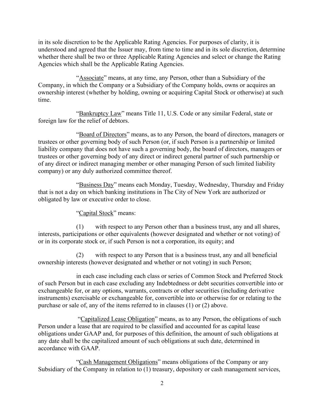 2自行决定为适用的评级机构。为明确起见,经理解并同意,发行人可不时自行酌情决定是否有两家或三家适用的评级机构,并选择或变更应为适用的评级机构的评级机构。“联系人”是指,在任何时候,除公司的附属公司外,公司或公司的附属公司持有、拥有或获得所有权权益(无论是通过持有、拥有或获得股本或其他方式)的任何人。“破产法”是指Title 11、美国法典或任何类似的联邦、州或外国法律对债务人的救济。“董事会”是指,就任何人而言,该人的董事会、经理或受托人或其他理事机构(或,如果该人是没有该理事机构的合伙企业或有限责任公司,则该合伙企业的任何直接或间接普通合伙人或该有限责任公司的任何直接或间接管理成员或其他理事机构的董事会、经理或受托人或其他理事机构)或其任何正式授权的委员会。“营业日”是指每周一、周二、周三、周四和周五,不是纽约市银行机构根据法律或行政命令被授权或有义务关闭的日子。“股本”是指:(1)就商业信托以外的任何人而言,其公司股票的任何和所有股份、权益、参与或其他等价物(无论是否被指定和投票),或,如果该人不是公司,则为其股权;(2)就任何属于商业信托的人而言,该人士的任何及所有实益拥有权益(不论是否指定及是否投票);在每宗个案中,包括该人士的每一类别或系列普通股及优先股,但在每宗个案中,不包括可转换为或可交换的任何债务或债务证券,或可行使或交换、可转换为或以其他方式用于或与购买或出售上述第(1)或(2)条所指的任何项目有关的任何期权、认股权证、合约或其他证券(包括衍生工具)。“资本化租赁义务”就任何人而言,是指根据公认会计原则,要求将该人在租赁项下的义务分类并作为资本租赁义务进行会计处理,就本定义而言,在任何日期的此类义务的金额应为在该日期根据公认会计原则确定的此类义务的资本化金额。「现金管理义务」指公司或公司任何附属公司就(1)金库、存管或现金管理服务、