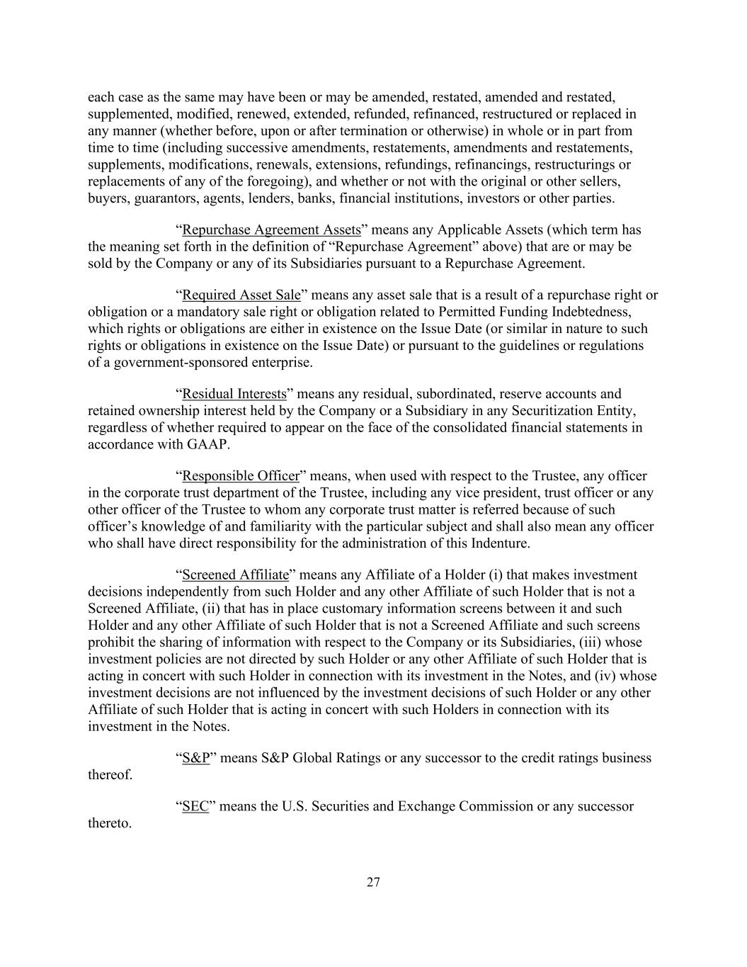 27每宗个案本身可能已或可能以任何方式(不论是在终止前、终止时或终止后或其他方式)全部或部分修订、重述、修订及重述、补充、修改、续期、延期、退款、再融资、重组或更换(包括连续修订、重述、修订及重述、补充、修改、续期、延期、退款、再融资、重组或更换上述任何一项),以及不论是否与原卖方或其他卖方、买方、担保人、代理人、贷款人、银行、金融机构、投资者或其他各方。“回购协议资产”是指公司或其任何附属公司根据回购协议正在或可能出售的任何适用资产(该术语具有上文“回购协议”定义中所述的含义)。“规定资产出售”是指任何资产出售,是由于回购权利或义务或与许可融资债务相关的强制出售权利或义务,这些权利或义务要么在发行日存在(或性质类似于在发行日存在的此类权利或义务),要么根据政府资助企业的准则或规定。“剩余权益”是指公司或子公司在任何证券化实体中持有的任何剩余、次级、储备账户和保留所有权权益,无论是否需要根据公认会计原则出现在合并财务报表的正面。“负责人员”(Responsible Officer)是指,就受托人而言,受托人的公司信托部门的任何高级人员,包括任何副总裁、信托高级人员或因任何公司信托事项的高级人员对特定主题的了解和熟悉而被转介给的受托人的任何其他高级人员,也应指对本契约的管理负有直接责任的任何高级人员。“经筛选关联公司”是指持有人的任何关联公司(i)独立于该持有人作出投资决策,以及该持有人的任何其他非经筛选关联公司的关联公司,(ii)在其与该持有人之间设置了惯常的信息屏幕,以及该持有人的任何其他非经筛选关联公司的关联公司,且该等屏幕禁止共享与公司或其子公司有关的信息,(iii)其投资政策并非由该持有人或与该持有人就其对票据的投资一致行动的任何其他关联人指示,及(iv)其投资决定不受该持有人或与该持有人就其对票据的投资一致行动的任何其他关联人的投资决定的影响。“标普”是指标普全球评级或其信用评级业务的任何继承者。“SEC”是指美国证券交易委员会或其任何继任者。