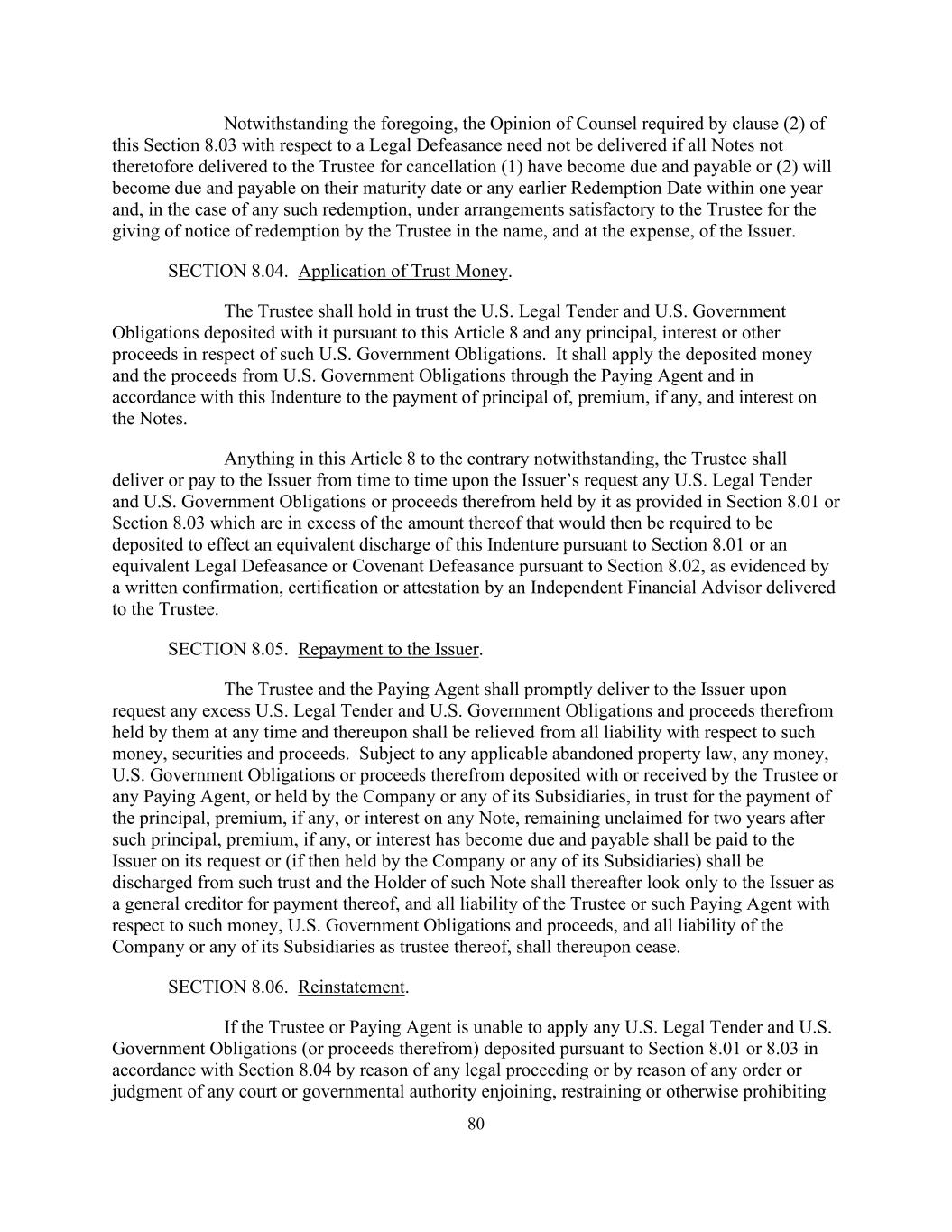 80尽管有上述规定,如所有未在此之前交付予受托人注销的票据(1)已到期应付,或(2)将于其到期日或一年内任何较早的赎回日期到期应付,且如属任何该等赎回,则根据受托人满意的安排,由受托人以发行人的名义并以费用支付的方式发出赎回通知,则本条第(2)条所规定的有关法定撤销的大律师意见无须交付。第8.04节。信托资金的运用。受托人应以信托方式持有根据本条第8款存放于其的美国法定投标书和美国政府债务以及与该等美国政府债务有关的任何本金、利息或其他收益。它应将存入的款项和通过付款代理并按照本契约从美国政府债务中获得的收益用于支付票据的本金、溢价(如有)和利息。尽管本条第8条中有任何相反的规定,但受托人应应发行人的请求不时向发行人交付或支付其根据第8.01条或第8.03条规定持有的任何美国法定投标和美国政府债务或由此产生的收益,这些金额超过根据第8.01条将被要求存入以实现本义齿的等价解除或根据第8.02条的等价法律失效或盟约失效的金额,并经书面确认证明,由独立财务顾问向受托人提供的证明或证明。第8.05节。偿还发行人。受托人和付款代理人应要求及时向发行人交付其在任何时间持有的任何超额的美国法定投标和美国政府义务及其收益,并据此免除与该等款项、证券和收益有关的所有责任。在符合任何适用的废弃财产法的规定下,由受托人或任何付款代理人存放或收取的任何款项、美国政府债务或由此产生的收益,或由公司或其任何子公司以信托方式持有,用于支付任何票据的本金、溢价(如有)或利息,但在该等本金、溢价(如有)后两年内仍无人认领,或利息已到期应付,须应发行人的要求向其支付,或(如当时由公司或其任何附属公司持有)须解除该信托,而该票据的持有人其后须仅视发行人为一般债权人以支付该款项,而受托人或该付款代理人就该等款项、美国政府债务及收益所承担的所有责任,以及公司或其任何附属公司作为其受托人所承担的所有责任,随即终止。第8.06节。复职。如受托人或付款代理人因任何法律程序或因任何法院或政府当局的命令或判决禁止、限制或以其他方式禁止而无法根据第8.04条适用根据第8.01或8.03条存放的任何美国法定投标和美国政府义务(或由此产生的收益)
