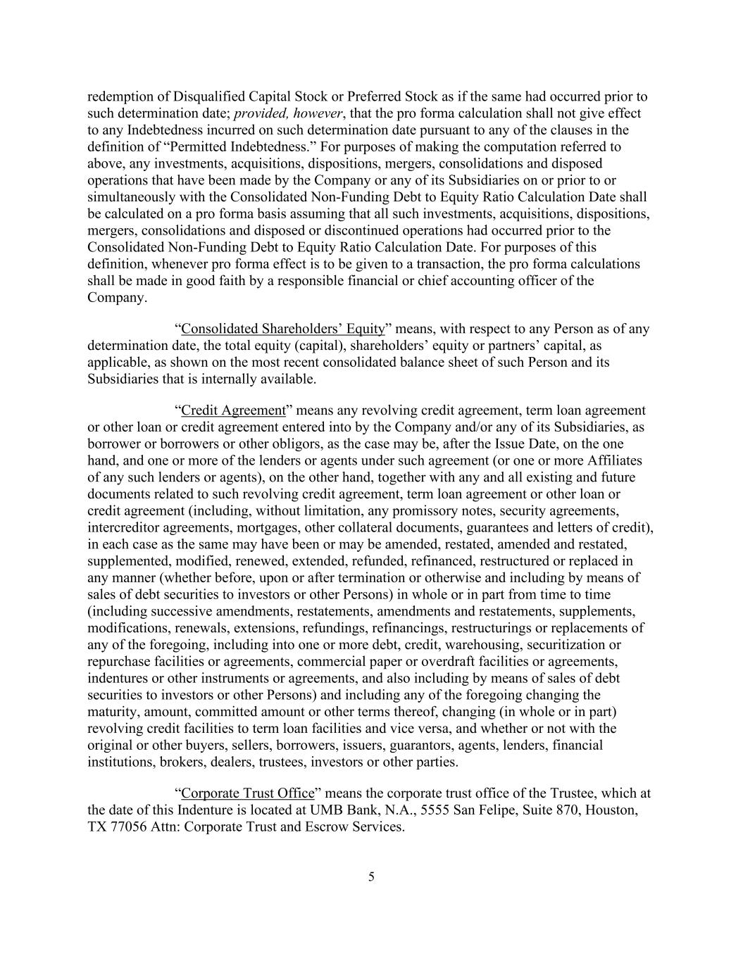 5赎回不合格股本或优先股,如同同样的情况发生在该确定日期之前;但条件是,根据“允许的债务”定义中的任何条款,备考计算不应使在该确定日期发生的任何债务生效。为进行上述计算,公司或其任何附属公司在合并非供资债对权益比率计算日或之前或同时进行的任何投资、收购、处置、合并、合并和处置业务,应在假定所有该等投资、收购、处置、合并、合并和处置或终止的业务已发生在合并非供资债对权益比率计算日之前的备考基础上进行计算。就本定义而言,每当要对交易给予备考效果时,应由公司负责的财务或首席会计官本着诚意进行备考计算。“合并股东权益”是指,就任何人而言,截至任何确定日期,该人及其子公司最近的内部可用的合并资产负债表所显示的总权益(资本)、股东权益或合伙人资本(如适用)。「信贷协议」指公司及/或其任何附属公司(视属何情况而定)于发行日期后订立的任何循环信贷协议、定期贷款协议或其他贷款或信贷协议,而该等协议项下的一名或多于一名贷款人或代理人(或任何该等贷款人或代理人的一名或多于一名联属公司),连同与该循环信贷协议、定期贷款协议或其他贷款或信贷协议有关的任何及所有现有及未来文件(包括,但不限于任何承兑票据、担保协议、债权人间协议、抵押、其他抵押文件、担保和信用证),在每种情况下,可能已经或可能以任何方式(无论是在终止之前、终止时或之后或其他方式,包括通过向投资者或其他人出售债务证券的方式)全部或部分地(包括连续的修订、重述、修订和重述、补充、修改、续期、延期、退款、再融资、重组或替换上述任何一项,包括一项或多项债务、信贷、仓储、证券化或回购便利或协议、商业票据或透支便利或协议、契约或其他文书或协议,也包括通过向投资者或其他人出售债务证券的方式)并包括上述任何变更期限、金额、承诺金额或其他条款、将(全部或部分)循环信贷便利变更为定期贷款便利、反之亦然,以及无论是否与原始或其他买方、卖方、借款人、发行人、担保人、代理人、贷款人、金融机构、经纪人、交易商、受托人、投资者或其他方。“企业信托办公室”是指受托人的企业信托办公室,该办公室于本契约日期位于UMB银行,N.A.,5555 San Felipe,Suite 870,Houston,TX77056 ATTn:Corporate Trust and Escrow Services。