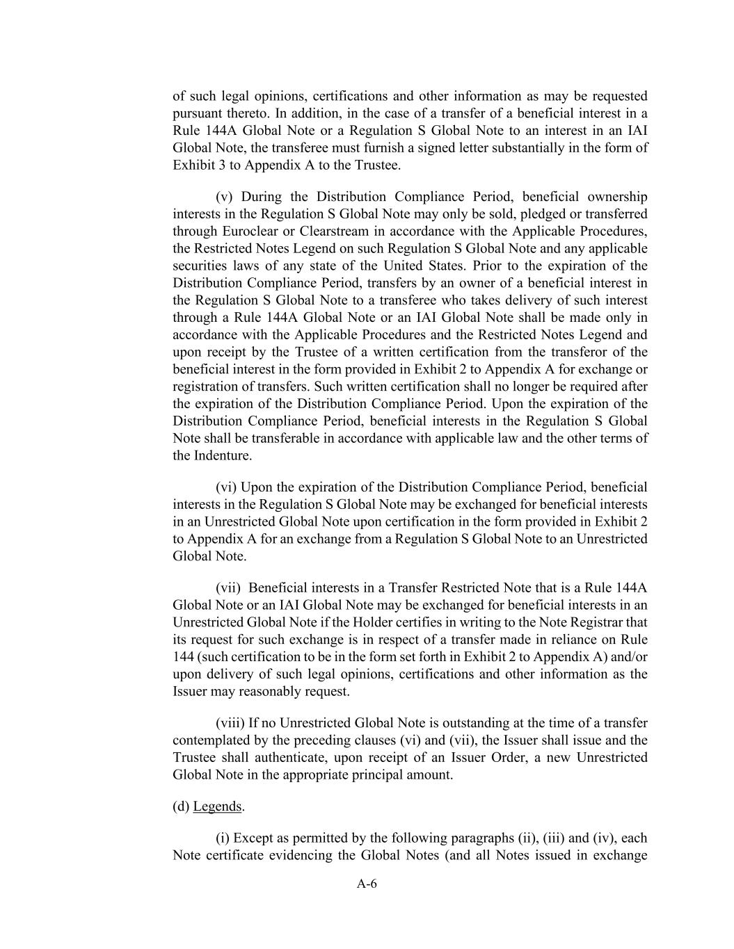 A-6的法律意见、证明和根据其可能要求提供的其他信息。此外,在将第144A条全球票据的实益权益或第S条全球票据的实益权益转让给IAI全球票据的权益的情况下,受让方必须向受托人提供一份以附录A的大致形式呈现的TERM3的签名信函。(v)在分配合规期内,S条例全球票据的实益所有权权益只能根据适用程序、该条例S全球票据上的限制性票据图例以及美国任何州的任何适用证券法通过Euroclear或Clearstream出售、质押或转让。在分配合规期届满之前,S条例全球票据的实益权益所有人向通过第144A条全球票据或IAI全球票据收取该等权益交付的受让人进行的转让,仅应按照适用程序和限制性票据图例,并在受托人收到转让人就该实益权益提供的书面证明后,方可进行交换或登记转让。分销合规期届满后,不再要求提供此类书面证明。在分配合规期届满时,S条例全球票据中的实益权益应可根据适用法律和义齿的其他条款进行转让。(vi)于分销合规期届满时,S规例全球票据中的实益权益经附录A的附件 2中提供的格式认证后,可交换为非限制性全球票据中的实益权益,以进行从S规例全球票据到非限制性全球票据的交换。(vii)属于规则144A全球票据或IAI全球票据的转让受限制票据的实益权益可以交换为无限制全球票据的实益权益,前提是持有人以书面向票据登记处证明其进行此类交换的请求是关于依据规则144进行的转让(该证明应采用附录A的附件 2中规定的形式)和/或在交付发行人可能合理要求的此类法律意见、证明和其他信息时。(viii)如果在前述第(vi)和(vii)条所设想的转让时没有未偿还的非限制性全球票据,则发行人应在收到发行人命令后发行和受托人应认证本金适当金额的新的非限制性全球票据。(d)传说。(i)除以下第(二)、(三)和(四)款许可外,证明全球票据的每份票据凭证(以及所有以交换方式发行的票据
