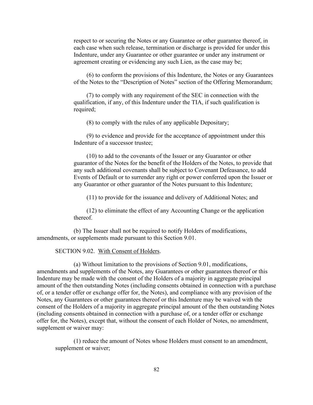 82关于或担保票据或其任何担保或其他担保,在根据本契约、根据任何担保或其他担保或根据产生或证明任何此类留置权的任何文书或协议(视情况而定)规定解除、终止或解除的每一种情况下;(6)使本契约、票据或票据的任何担保的规定符合发售备忘录的“票据说明”部分;(7)遵守美国证券交易委员会有关资格的任何要求(如有),(8)遵守任何适用的保存人的规则;(9)提供证据,并就根据本契约接受委任继任受托人作出规定;(10)为票据持有人的利益,在发行人或票据的任何担保人或其他担保人的契诺中增加规定,任何该等附加契诺须受契约失效的规限,增加违约事件或放弃根据本契约赋予票据发行人或任何担保人或其他担保人的任何权利或权力;(11)就发行和交付额外票据作出规定;及(12)消除任何会计变更或其应用的影响。(b)发行人无须将依据本条第9.01条作出的修改、修订或补充通知持有人。第9.02节。经持有人同意。(a)在不限于第9.01条的规定下,票据、其任何担保或其他担保或本契约的修改、修订和补充,可在当时未偿还票据的本金总额过半数的持有人同意(包括就购买票据、要约收购或交换要约而取得的同意)以及遵守票据的任何规定的情况下作出,其任何担保或其他担保或本契约可经当时未偿还票据本金总额多数的持有人同意(包括就购买票据、要约收购或交换要约取得的同意)而放弃,但未经每名票据持有人同意,任何修订、补充或放弃不得:(1)减少持有人必须同意修订、补充或放弃的票据数量;