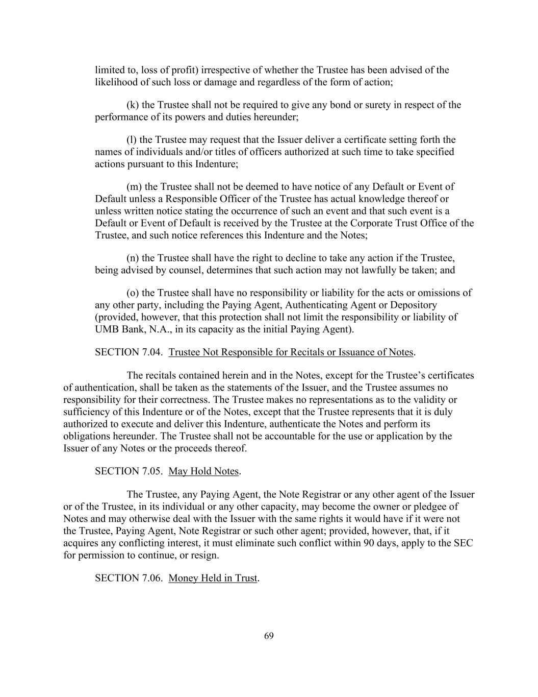 69只限于,利润损失),不论受托人是否已被告知该等损失或损害的可能性,亦不论诉讼的形式如何;(k)受托人无须就其根据本协议行使的权力及职责给予任何保证或担保;(l)受托人可要求(m)除非受托人的负责人员实际知悉任何违约或违约事件,或除非受托人在受托人的公司信托办公室收到书面通知,说明发生此类事件且该事件为违约或违约事件,否则发行人交付的证明载明当时根据本契约被授权采取特定行动的个人姓名和/或高级职员的职衔;(m)受托人不得被视为收到任何违约或违约事件的通知,且该通知引用了本契约和票据;(n)如果受托人在得到大律师的建议后确定可能无法合法地采取任何行动,则受托人有权拒绝采取任何行动;以及(o)受托人对任何其他方的作为或不作为不承担任何责任或义务,包括付款代理人、认证代理人或存管人(但前提是,这种保护不应限制以初始付款代理人身份的UMB银行的责任或义务)。第7.04节。受托人不负责朗诵或发行票据。本文和附注中所载的陈述,除受托人的认证证书外,均应被视为发行人的陈述,受托人对其正确性不承担任何责任。受托人不对本义齿或票据的有效性或充分性作出任何陈述,除非受托人声明其被正式授权执行和交付本义齿、认证票据并履行其在本协议项下的义务。受托人不得对发行人使用或申请任何票据或其收益负责。第7.05节。可能会持有票据。受托人、任何付款代理人、票据登记处或发行人的任何其他代理人或受托人的任何其他代理人,以其个人或任何其他身份,可以成为票据的所有者或质权人,并可以其他方式与发行人处理其在不是受托人、付款代理人、票据登记处或此类其他代理人时将拥有的相同权利;但前提是,如果其获得任何利益冲突,则必须在90天内消除此类冲突,向SEC申请许可继续,或辞职。第7.06节。以信托形式持有的资金。