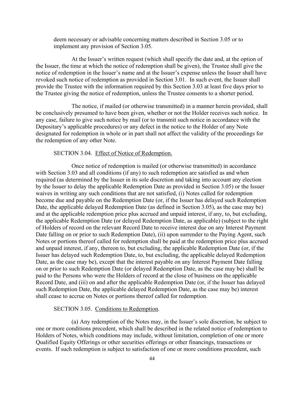 44认为有必要或可取涉及第3.05节所述事项或执行第3.05节的任何规定。应发行人的书面请求(其中应指明发出赎回通知的日期,并由发行人自行选择的时间),受托人应以发行人的名义发出赎回通知,费用由发行人承担,但发行人已撤销第3.01条规定的赎回通知的除外。在这种情况下,发行人应在受托人发出赎回通知至少五天前向受托人提供本条3.03所要求的信息,除非受托人同意更短的期限。该通知,如以本协议规定的方式邮寄(或以其他方式传送),则无论持有人是否收到该通知,均应被最终推定为已发出。在任何情况下,未以邮寄方式发出该通知(或未按照保存人的适用程序传送该通知)或通知中的任何缺陷全部或部分指定赎回的任何票据的持有人,均不影响赎回任何其他票据的程序的有效性。第3.04节。赎回通知的效力。一旦根据第3.03条邮寄(或以其他方式传送)赎回通知,而有关赎回的所有条件(如有的话)在需要时获得满足(由发行人全权酌情决定,并考虑到发行人选择延迟第3.05条规定的适用赎回日期),或发行人以书面放弃任何未获满足的该等条件,(i)要求赎回的票据于赎回日期到期应付(或,如发行人已延迟该赎回日期,适用的延迟赎回日期(定义见第3.05条)(视属何情况而定)及按适用的赎回价格加上应计及未付利息(如有的话)至(但不包括)适用的赎回日期(或适用的延迟赎回日期)(但有关纪录日期的记录持有人有权收取在该赎回日期或之前的任何利息支付日期到期的利息),(ii)在向付款代理人交回时,要求赎回的该等票据或其部分须按赎回价格加上应计及未付利息支付,如有,则于适用的赎回日期(或,如发行人已延迟该赎回日期,则延迟至(但不包括)适用的延迟赎回日期(视属何情况而定),但于该赎回日期(或延迟赎回日期,视属何情况而定)或之前的任何利息支付日期应付的利息须支付予于适用的记录日期营业结束时为记录持有人的人士,及(iii)于适用的赎回日期及之后(或,如发行人已延迟该赎回日期,适用的延迟赎回日期(视属何情况而定)应停止就要求赎回的票据或其部分产生利息。第3.05节。赎回的条件。(a)发行人可全权酌情决定票据的任何赎回,但须遵守一项或多项先决条件,这些先决条件应在向票据持有人发出的相关赎回通知中描述,这些条件可包括但不限于完成一项或多项合格股票发行或其他证券发行或其他融资、交易或事件。如该等赎回须符合一项或多于一项先决条件,则该等