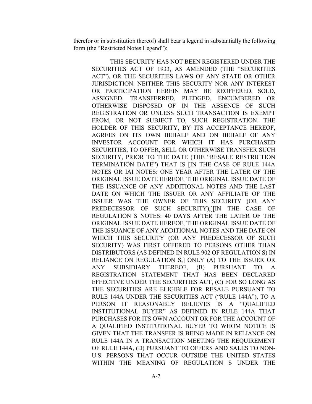 A-7代之或代之)应带有大致如下形式的图例(“限制性票据图例”):该证券尚未根据经修订的1933年《证券法》(“证券法”)或任何国家或其他司法管辖区的证券法进行登记。该证券或此处的任何权益或参与均不得在没有此种登记的情况下被重新转让、出售、转让、转让、质押、担保或以其他方式处置,除非此种交易被豁免于或不受此种登记的约束。该证券的持有人在此接受后,同意自行并代表其已购买证券的任何投资者账户,在该日期(“转售限制终止日”)之前提供、出售或以其他方式转让该证券,即[在规则144a票据或IAI票据的情况下:在此处的原始发行日期较晚的一年后,发行任何额外票据的原始发行日期,以及发行人或发行人的任何附属公司为本证券(或该证券的任何前身)所有人的最后日期,] [在条例S注的情况下:在本条例的原始发行日期较晚的40天后,发行任何额外票据的原始发行日期,以及本证券(或该证券的任何前身)首次依据第s条向发行人以外的人(如第s条第902条所定义)提供的日期,]仅(a)向发行人或其任何附属公司,(b)根据已宣布有效的登记声明对于它有理由认为是第144a条规则所定义的“合格机构买方”的人而言,该人为自己的账户或为合格机构买方的账户进行购买,并向其发出通知称,转让是在符合第144a条规则要求的交易中根据第144a条规则进行的,(d)根据向发生在外部的非美国人的要约和销售