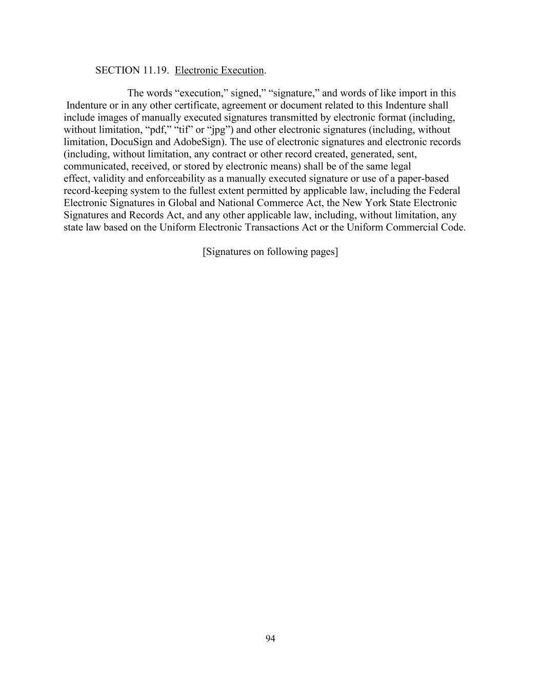 94第11.19款。电子执行。本义齿或与本义齿有关的任何其他证书、协议或文件中的“执行”、“签名”、“签名”等字样和类似导入的字样,应包括以电子格式(包括但不限于“pdf”、“tif”或“jpg”)传输的人工执行签名和其他电子签名(包括但不限于DocuSign和AdobeSign)的图像。使用电子签名和电子记录(包括但不限于通过电子方式创建、生成、发送、传达、接收或存储的任何合同或其他记录),应在适用法律,包括《全球和国家商务联邦电子签名法》、《纽约州电子签名和记录法》以及任何其他适用法律,包括但不限于基于《统一电子交易法》或《统一商法典》的任何州法律允许的最大范围内,与手工执行的签名或使用纸质记录保存系统具有相同的法律效力、有效性和可执行性。【以下各页签名】