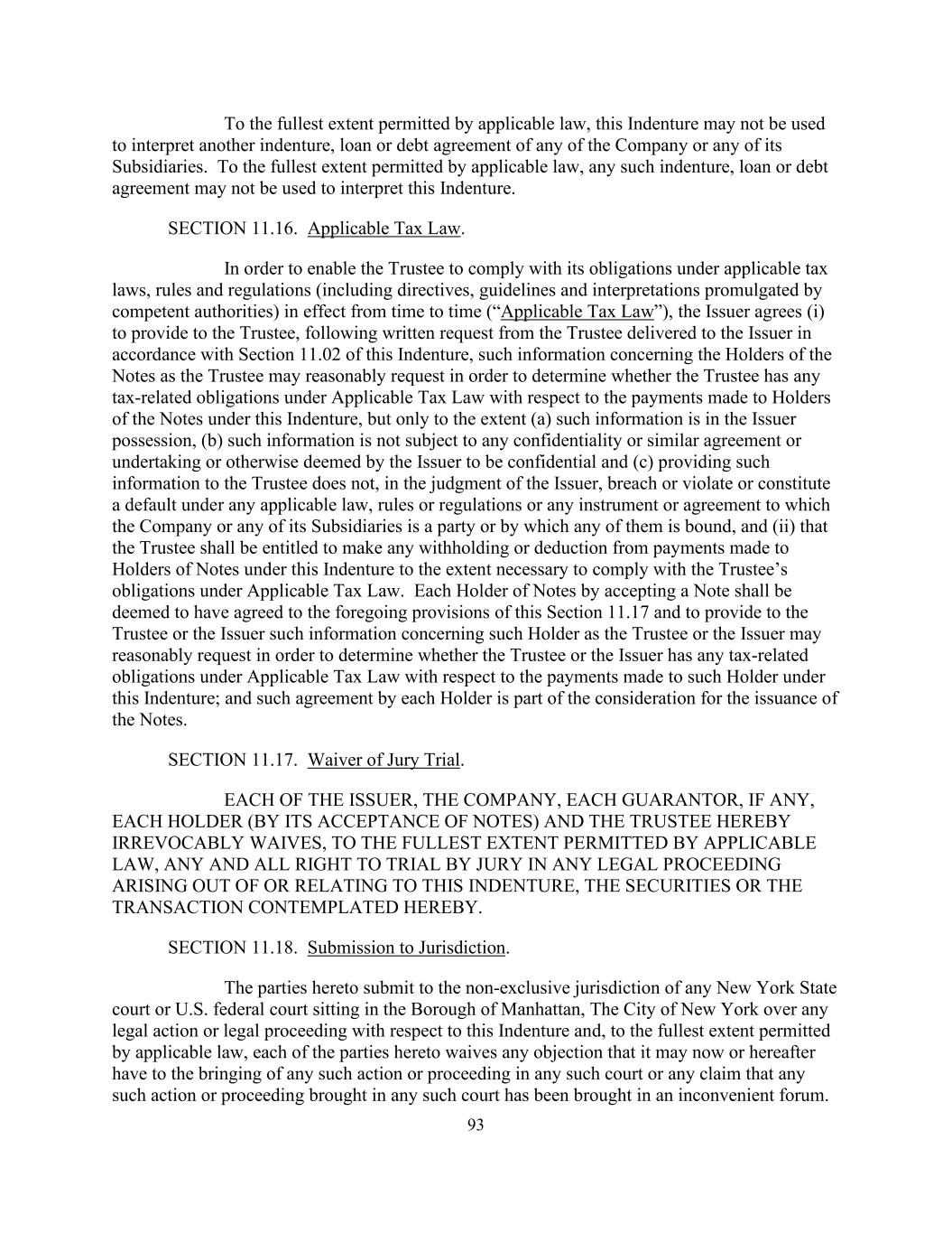93在适用法律允许的最大范围内,本契约不得用于解释公司或其任何子公司的另一份契约、贷款或债务协议。在适用法律允许的最大范围内,任何此类契约、贷款或债务协议不得用于解释本契约。第11.16节。适用税法。为使受托人能够遵守其根据不时生效的适用税法、规则和条例(包括主管当局颁布的指令、指南和解释)(“适用税法”)承担的义务,发行人同意(i)在受托人根据本义齿第11.02节向发行人送达的书面请求后,向受托人提供,受托人可能合理要求的有关票据持有人的信息,以确定受托人是否根据适用税法就根据本契约向票据持有人支付的款项承担任何与税务相关的义务,但仅限于(a)该等信息由发行人拥有,(b)该等信息不受任何保密或类似协议或承诺的约束,或发行人以其他方式认为是机密的,以及(c)向受托人提供该等信息并不根据发行人的判断,违反或违反任何适用法律、规则或条例或公司或其任何附属公司为一方或其中任何一方受其约束的任何文书或协议,或构成违约,以及(ii)受托人有权在遵守适用税法规定的受托人义务所需的范围内,从根据本契约向票据持有人支付的款项中进行任何预扣或扣除。通过接受票据的每一持票人,应被视为已同意本条第11.17条的前述规定,并向受托人或发行人提供受托人或发行人合理要求的有关该持票人的信息,以确定受托人或发行人是否根据适用税法就根据本契约向该持票人支付的款项承担任何与税务相关的义务;而每一持票人的此种约定是发行票据对价的一部分。第11.17节。放弃陪审团审判。发行人、公司、每个担保人(如有的话)、每个持有人(通过其接受票据)和受托人在此不可撤销地在适用法律允许的最大限度内放弃因本契约、证券或此处所设想的交易而产生或与之有关的任何法律程序中由陪审团审判的任何和所有权利。第11.18节。提交司法管辖。本合同双方就与本契约有关的任何法律诉讼或法律程序提交任何纽约州法院或设在纽约市曼哈顿区的美国联邦法院的非专属管辖权,并在适用法律允许的最大范围内,本合同各方均放弃其现在或以后可能对在任何该等法院提起任何该等诉讼或程序提出的任何异议,或对在任何该等法院提起的任何该等诉讼或程序已在不方便的法院提起的任何索赔提出的任何异议。