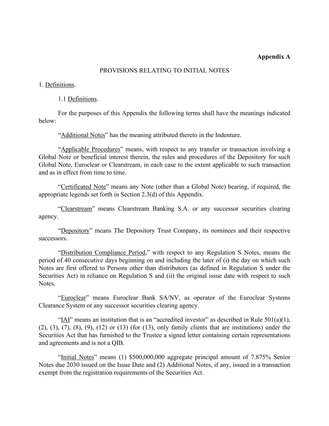 附录a有关初始说明1的规定。定义。1.1定义。就本附录而言,以下术语应具有下述含义:“附加说明”具有义齿中赋予的含义。“适用程序”是指,就涉及全球票据或其中实益权益的任何转让或交易而言,在每种情况下,在适用于此类交易并不时生效的范围内,存管人对此类全球票据、Euroclear或Clearstream的规则和程序。“认证票据”是指任何票据(全球票据除外),如果需要,带有本附录第2.3(d)节中规定的适当图例。“Clearstream”是指Clearstream Banking S.A.或任何后续证券清算机构。“存管”是指存管信托公司、其被提名人及其各自的继任者。“分销合规期”,就任何S条例票据而言,是指自(i)首次根据S条例向分销商以外的人(定义见《证券法》下的S条例)发售此类票据之日和(ii)有关此类票据的原始发行日期(以较晚者为准)开始的连续40天期间。“Euroclear”是指Euroclear Bank SA/NV,作为Euroclear Systems清算系统的运营商或任何后续证券清算机构。“IAI”是指属于《证券法》规定的规则501(a)(1)、(2)、(3)、(7)、(8)、(9)、(12)或(13)(对于(13)而言,仅针对属于机构的家庭客户)中所述的“合格投资者”且已向受托人提供载有某些陈述和协议的已签署信函且不属于QIB的机构。“初始票据”是指(1)在发行日发行的本金总额为500,000,000美元、利率为7.875%、于2030年到期的优先票据,以及(2)在豁免《证券法》登记要求的交易中发行的额外票据(如有)。