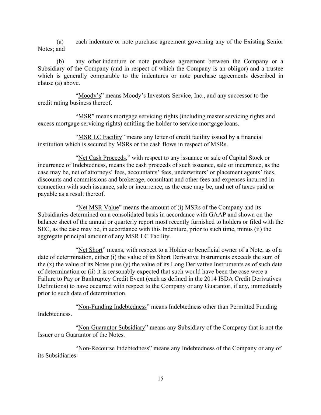 15(a)管辖任何现有优先票据的每份契约或票据购买协议;及(b)公司或公司的附属公司(且公司为其债务人)与受托人之间的任何其他契约或票据购买协议,其一般与上述(a)条所述的契约或票据购买协议具有可比性。“穆迪”是指穆迪投资者服务公司,及其信用评级业务的任何继承者。“MSR”是指抵押服务权(包括主服务权和超额抵押服务权),赋予持有人服务抵押贷款的权利。“MSR LC Facility”是指金融机构签发的任何以MSR或MSR相关现金流为担保的信用证融资。“净现金收益”,就任何发行或出售股本或产生债务而言,是指此类发行、出售或发生(视情况而定)的现金收益,扣除律师费、会计师费、承销商或配售代理费、折扣和佣金以及与此类发行、出售或发生(视情况而定)有关的经纪、顾问和其他费用和开支,以及因此而支付或应付的税款。“MSR净值”是指公司及其子公司根据公认会计原则在综合基础上确定并显示在最近提交给持有人或根据本契约向SEC(视情况而定)提交的年度或季度报告的资产负债表上的(i)MSR的金额,在此之前减去(ii)任何MSR LC融资的本金总额。“净空头”是指,就票据的持有人或实益拥有人而言,截至确定之日,(i)其空头衍生工具的价值超过(x)其票据价值加上(y)截至该确定之日其多头衍生工具价值之和,或(ii)合理地预计,如果公司或任何担保人发生了未能付款或破产信用事件(每一项定义均在2014年ISDA信用衍生工具定义中定义),则会出现这种情况,如有,则在紧接该确定日期之前。“非融资性债务”是指许可融资债务以外的债务。「非担保人附属公司」指公司任何并非票据发行人或担保人的附属公司。“无追索权债务”是指公司或其任何子公司的任何债务: