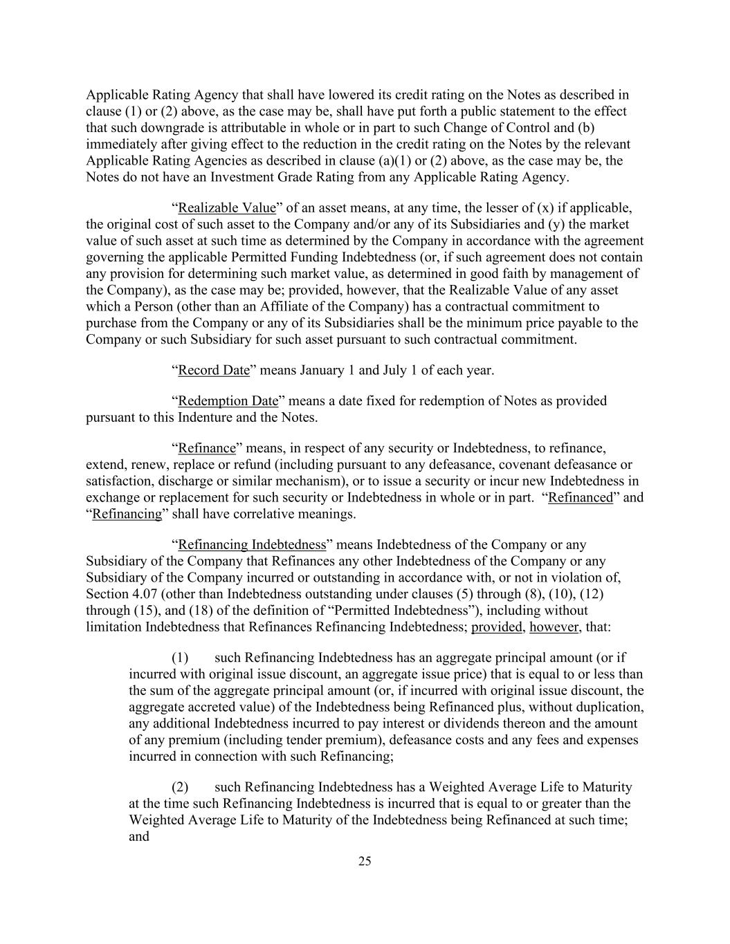 25须按上文第(1)或(2)条(视属何情况而定)所述降低其对票据的信贷评级的适用评级机构,须已提出公开声明,大意是该等降级可全部或部分归因于该等控制权变更,及(b)在上述(a)(1)或(2)条(视属何情况而定)所述的有关适用评级机构对票据的信贷评级下调生效后,这些票据没有任何适用的评级机构的投资级评级。资产的“可变现价值”是指,在任何时候,(x)(如适用)该资产对公司和/或其任何子公司的原始成本和(y)该资产在公司根据管辖适用的许可融资债务的协议确定的时间的市场价值(或者,如果该协议不包含任何确定该市场价值的条款,由公司管理层善意确定)(视情况而定)中的较低者;但是,前提是,任何人(公司的联属公司除外)有合约承诺向公司或其任何附属公司购买的任何资产的变现价值,应为根据该合约承诺就该资产应付公司或该附属公司的最低价格。“备案日期”是指每年的1月1日和7月1日。“赎回日期”是指根据本契约和票据规定为赎回票据而确定的日期。“再融资”是指,就任何证券或债务而言,再融资、展期、续期、替换或退款(包括根据任何撤销、契约撤销或满足、解除或类似机制),或发行证券或产生新的债务,以交换或替换全部或部分此类证券或债务。“再融资”与“再融资”应具有相关含义。“再融资债务”是指公司或公司任何附属公司根据第4.07条发生或未偿还的任何其他债务(“许可债务”定义第(5)至(8)、(10)、(12)至(15)和(18)条规定的未偿还债务除外),包括但不限于为再融资债务再融资的债务;但前提是:(1)该等再融资债务的本金总额(或如果以原始发行折扣发生,总发行价格)等于或小于被再融资债务的本金总额(或,如以原始发行折扣产生,则为总增值)加上(不重复)为支付利息或股息而产生的任何额外债务以及任何溢价(包括投标溢价)的金额之和,(2)该等再融资债务在该等再融资债务发生时的到期加权平均年限等于或大于当时被再融资债务的到期加权平均年限;和