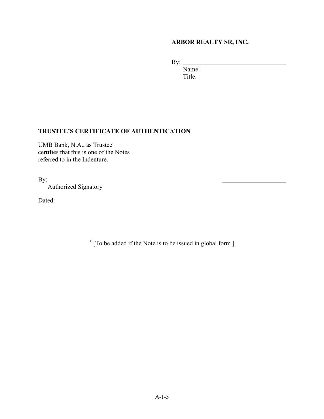 A-1-3 ARBOR REALTY SR,INC。By:Name:Title:TRUSTEE’s Certificate of Authentication UMB Bank,N.A.,as trustee certifies that this is one of the notes referred in the Indenture。由:______________________授权签字人日期:*【票据拟以全球形式发行时予以补充】