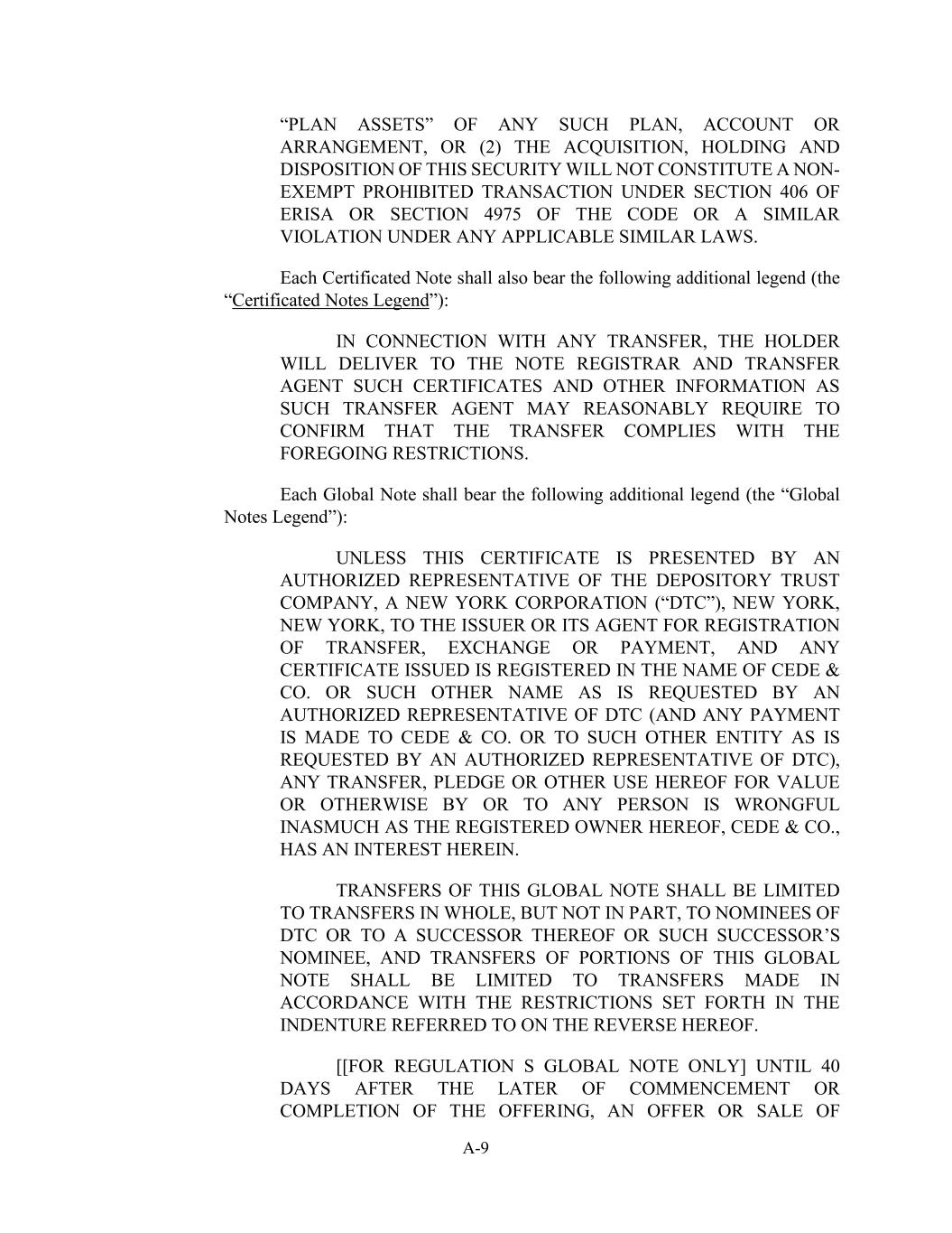A-9任何此类计划、账户或安排的“计划资产”,或(2)收购、持有和处置本证券将不构成根据ERISA第406条或《守则》第4975条的非豁免禁止交易或任何适用的类似法律下的类似违反。每份有凭证票据还应附有以下附加图例(“有凭证票据图例”):就任何转让而言,持有人将向票据登记官和转让代理人交付该转让代理人可能合理要求确认转让符合上述限制的此类证书和其他信息。每份全球票据须附有以下附加图例(“全球票据图例”):除非本凭证由存放信托公司、纽约公司(“DTC”)的授权代表向发行人或其转让、交换或付款登记代理人出示,且所签发的任何凭证均以CEDE & CO的名义登记。或DTC授权代表要求的其他名称(且任何款项均已支付给CEDE & CO。或向DTC获授权代表要求的其他实体)作出的任何转让、质押或以其他方式使用本协议以取得价值或由任何人或向任何人作出的任何转让、质押或以其他方式使用本协议均属错误,因为本协议的注册拥有人CEDE & CO.在本协议中拥有权益。本全球票据的转让应限于全部而非部分转让给DTC的被提名人或其继任者或该继任者的被提名人,本全球票据部分的转让应限于根据此处反面提及的契约中规定的限制进行的转让。【[仅适用于规例的全球票据】直至要约开始或完成后40天,要约或出售