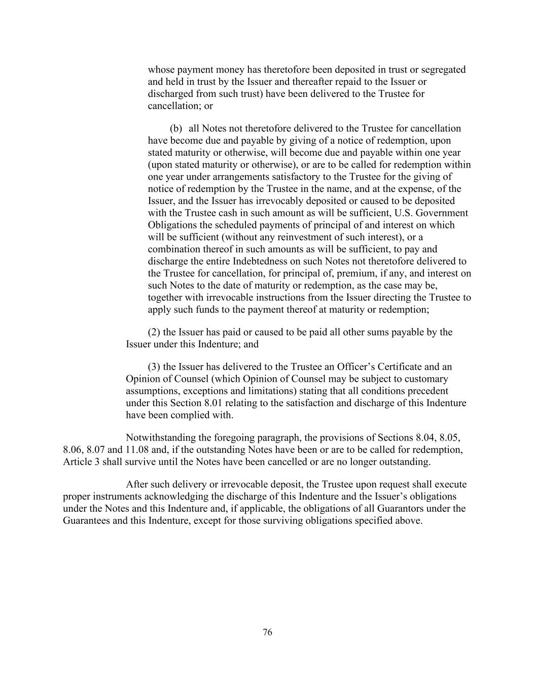 76其付款款项此前已以信托方式存放或由发行人隔离及以信托方式持有,其后偿还予发行人或解除该等信托)已交付予受托人注销;或(b)所有未在此之前交付予受托人注销的票据已到期并通过发出赎回通知而应付,在规定的到期日或其他情况下,将于一年内到期并应付(在规定的到期日或其他情况下),或将在受托人满意的安排下于一年内被要求赎回,由受托人以发行人的名义发出赎回通知,费用由发行人承担,且发行人已不可撤销地向受托人存入或安排存入足够金额的现金,美国政府有义务支付足够的本金和利息的预定付款(不进行此类利息的任何再投资),或以足够金额的组合,支付及解除此前未交付予受托人注销的该等票据的全部债务,以支付该等票据的本金、溢价(如有的话)及截至到期或赎回日期(视属何情况而定)的利息,连同发行人指示受托人将该等资金用于在到期或赎回时支付的不可撤销指示;(2)发行人已支付或促使支付发行人根据本契约应付的所有其他款项;及(3)发行人已向受托人交付高级人员证书和律师意见(律师的意见可能受惯常假设、例外情况和限制的约束),说明根据本条第8.01条有关满足和解除本契约的所有先决条件均已获遵守。尽管有前款规定,第8.04、8.05、8.06、8.07和11.08条的规定,如果未偿还的票据已经或将要被要求赎回,则第3条应继续有效,直至票据被注销或不再未偿还为止。在此类交付或不可撤销的存款之后,受托人应根据请求签署适当的文书,确认解除本义齿和发行人在票据和本义齿下的义务,以及(如适用)所有担保人在担保和本义齿下的义务,但上述规定的尚存义务除外。