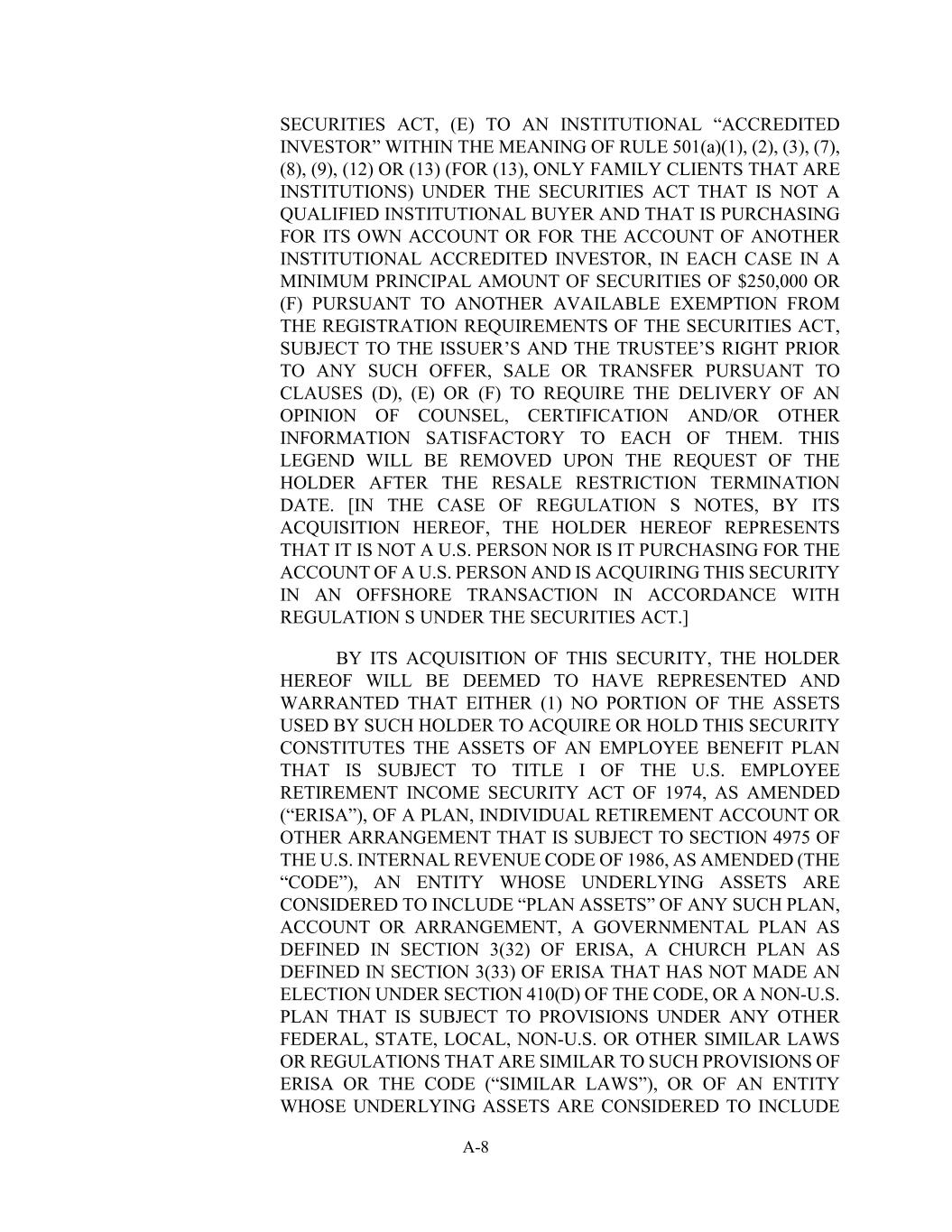 A-8证券法,(e)对规则501(a)(1)、(2)、(3)、(7)、(8)、(9)、(12)或(13)所指的机构“认可投资者”(针对(13),仅针对属于机构的家庭客户)根据证券法,不是合格的机构买方,并且正在为其自己的账户或为另一机构认可投资者的账户购买根据(d)、(e)或(f)条进行出售或转让,以要求向它们各自提供律师意见、证明和/或其他信息令人满意。在转售限制终止日期后,根据持有人的要求,本传说将被删除。[在Regulation S Notes的情况下,通过其在此获得,此处的持有人表示其不是美国人,也不是为美国人的账户购买,并且正在根据《证券法》下的Regulation S在离岸交易中获得这种证券。]通过其在此获得这种证券,此处的持有人将被视为已代表并保证(1)该持有人用于获得或持有该证券的资产的任何部分均不构成受经修订的1974年美国《雇员退休收入保障法》(“ERISA”)标题I约束的雇员福利计划、个人退休账户或其他安排的资产。账户或安排,ERISA第3(32)条定义的政府计划,ERISA第3(33)条定义的未根据《守则》第410(d)条进行选举的教会计划,或受任何其他联邦、州、地方、非美国或与ERISA或《守则》的此类规定类似的其他类似法律或法规(“