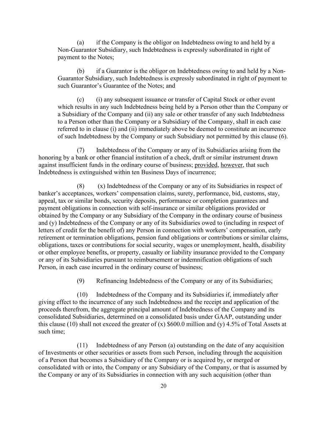 20(a)如果公司是欠非担保子公司并由其持有的债务的义务人,则该债务在受偿权上明确从属于票据;(b)如果担保人是欠非担保子公司并由其持有的债务的义务人,该等债务在受偿权上明确从属于该担保人对票据的担保;及(c)(i)任何其后发行或转让股本或导致任何该等债务由公司或公司附属公司以外的人持有的其他事件,及(ii)任何该等债务出售或以其他方式转让予公司或公司附属公司以外的人,在紧接上述第(i)及(ii)条所提述的每宗个案中,须被视为构成公司或该附属公司产生本第(6)条所不允许的该等债务。(7)公司或其任何附属公司因银行或其他金融机构在正常经营过程中以不足的资金支取的支票、汇票或类似票据而产生的债务;但前提是该等债务在发生后十个营业日内消灭;(8)(x)公司或其任何附属公司就银行承兑、工人赔偿要求、担保、履约、投标、海关、中止、上诉、税款或类似债券、保证金、与公司或公司任何附属公司在日常业务过程中提供或获得的自保或类似义务有关的履约或完成担保和付款义务,以及(y)公司或其任何附属公司因工人赔偿、提前退休或终止义务、养老基金义务或供款或类似索赔、义务、社会保障的税款或供款、工资或失业、健康、残疾或其他雇员福利或财产而欠任何人(包括为其利益的信用证)的债务,根据该人的偿付或赔偿义务向公司或其任何附属公司提供的伤亡或责任保险,在每种情况下均在正常业务过程中发生;(9)公司或其任何附属公司的再融资债务;(10)公司及其附属公司的债务,如果在紧接任何该等债务的发生以及由此产生的收益的收取和应用生效后,公司及其合并附属公司的债务本金总额,根据公认会计原则按合并基础确定,根据本条第(10)款未偿还的债务不得超过(x)6亿美元和(y)当时总资产的4.5%中的较高者;(11)任何人(a)在向该人收购投资或其他证券或资产之日未偿还的债务,包括通过收购成为公司的附属公司或被公司或公司的任何附属公司收购、或与公司或其任何附属公司合并或合并的人,或由公司或其任何附属公司就任何该等收购承担的债务(除