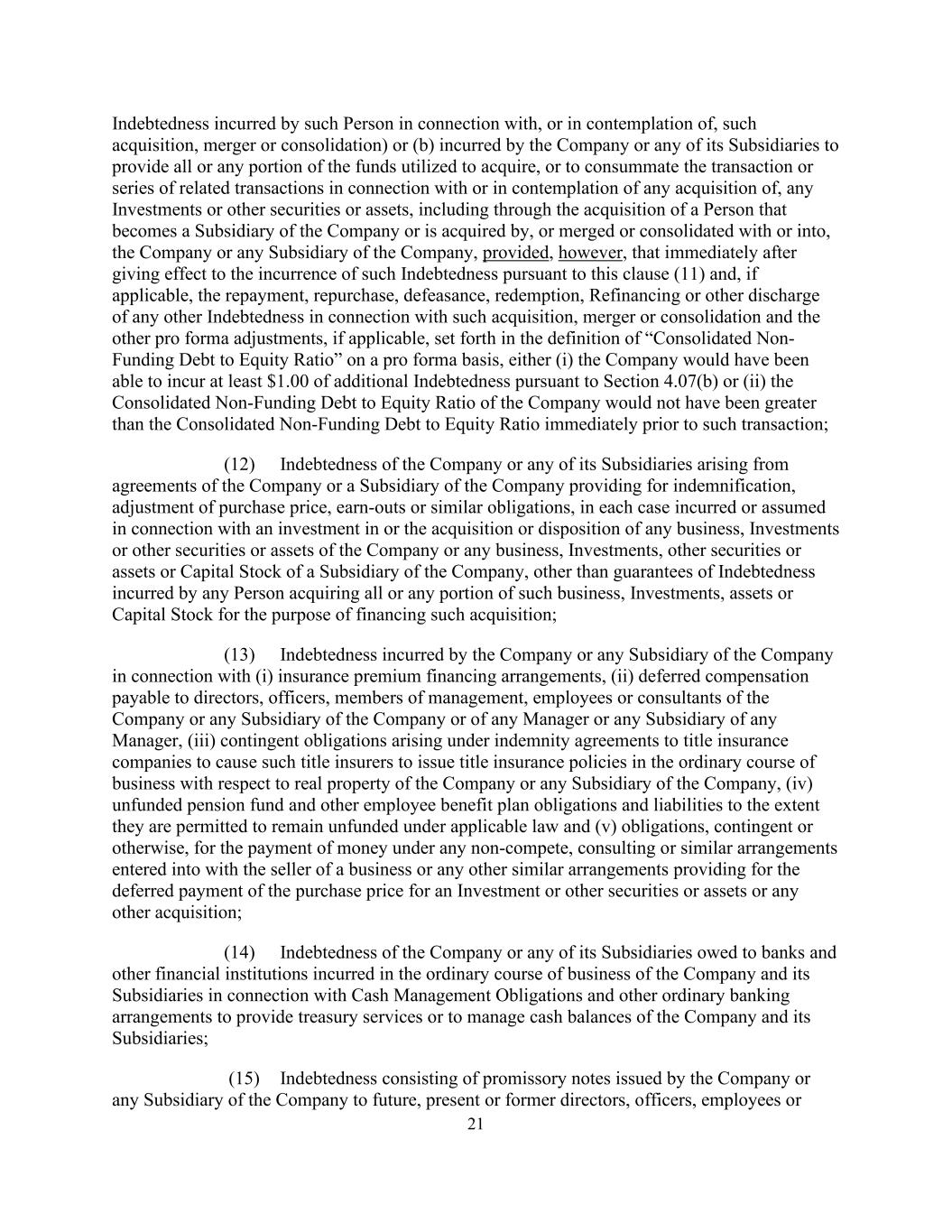 21该等人士因该等收购、合并或合并而招致或考虑该等收购、合并或合并)或(b)公司或其任何附属公司因提供全部或任何部分资金而招致的债务,或为完成与任何收购或考虑收购任何投资或其他证券或资产有关的交易或一系列相关交易而招致的债务,包括通过收购成为公司附属公司或被公司收购、或与或合并或合并的人士而招致的债务,然而,公司或公司的任何附属公司规定,在根据本第(11)条产生该等债务以及(如适用)与该等收购、合并或合并有关的任何其他债务的偿还、回购、撤销、赎回、再融资或其他解除以及“合并非融资债务与权益比率”定义中所载的其他备考调整(如适用)生效后,(i)根据第4.07(b)节,公司将能够产生至少1.00美元的额外债务,或(ii)公司的综合非资金债务与权益比率不会高于紧接此类交易之前的综合非资金债务与权益比率;(12)公司或其任何子公司因公司或公司的子公司的协议规定赔偿、调整购买价格、盈利或类似义务而产生的债务,在每宗个案中,就投资或收购或处置公司的任何业务、投资或其他证券或资产或公司附属公司的任何业务、投资、其他证券或资产或股本而招致或承担的责任,但任何人为该等收购融资而收购该等业务、投资、资产或股本的全部或任何部分而招致的债务担保除外;(13)公司或公司任何附属公司就(i)保险费融资安排招致的债务,(ii)应付予公司或公司任何附属公司或任何经理人或任何经理人的任何附属公司的董事、高级人员、管理层成员、雇员或顾问的递延补偿,(iii)根据向产权保险公司订立的弥偿协议产生的或有债务,促使该等产权保险人在正常业务过程中就公司或公司任何附属公司的不动产签发产权保险单,(iv)无资金准备的养恤基金及其他雇员福利计划的义务及负债,但以根据适用法律获准保持无资金准备为限,及(v)根据任何竞业禁止条款支付款项的或有或其他义务,与业务的卖方订立的谘询或类似安排,或就一项投资或其他证券或资产的购买价款或任何其他收购作出规定的任何其他类似安排;(14)公司或其任何附属公司在公司及其附属公司的日常业务过程中因现金管理义务和其他普通银行安排提供库务服务或管理公司现金余额而欠银行和其他金融机构的债务及其附属公司;(15)由公司或公司任何附属公司向未来、现任或前任董事、高级人员、雇员或
