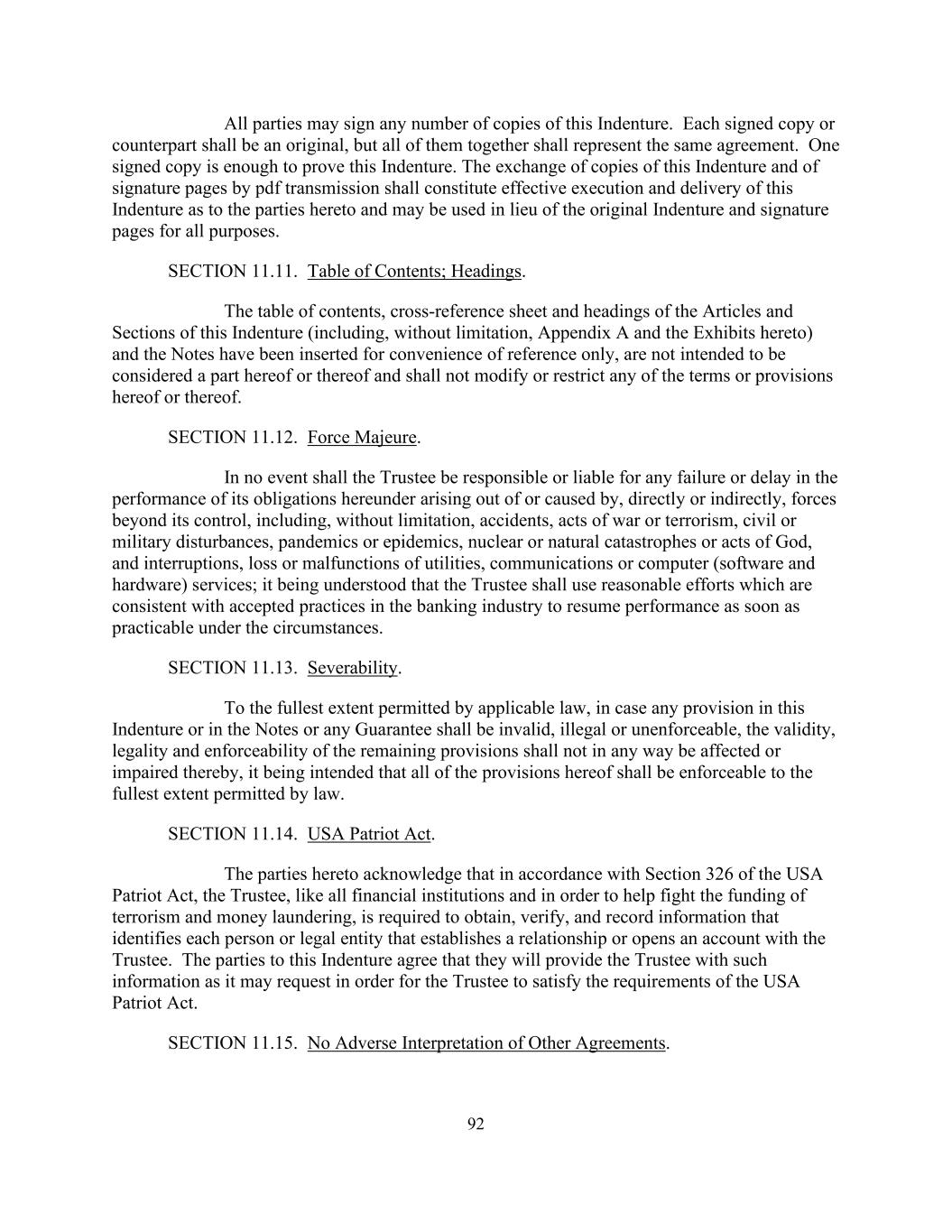 92各方可签署本契约的任意数量的副本。每一签名副本或对应副本应为原件,但全部加在一起代表同一约定。一份签名的复印件,足以证明这份契约。以pdf传输方式交换本契约的副本和签名页,应构成对本契约各方的有效执行和交付,并可用于所有目的,以代替原始契约和签名页。第11.11节。目录;标题。本指南的各条款和章节(包括但不限于附录A和附件)的目录、交叉参照表和标题以及附注仅为便于参考而插入,无意被视为本协议或其一部分,且不得修改或限制本协议或其任何条款或规定。第11.12节。不可抗力。在任何情况下,受托人均不对由其无法控制的力量(包括但不限于事故、战争或恐怖主义行为、民事或军事骚乱、流行病或流行病、核或自然灾害或上帝的行为,以及公用事业的中断、损失或故障)直接或间接引起或造成的任何未能或延迟履行其在本协议项下的义务承担责任或承担责任,通信或计算机(软硬件)服务;据了解,受托人应在实际可行的情况下,采取与银行业公认做法一致的合理努力,尽快恢复履约。第11.13节。可分割性。在适用法律允许的最大范围内,如本义齿或票据中的任何条款或任何保证无效、非法或不可执行,则其余条款的有效性、合法性和可执行性不因此而受到任何影响或损害,意在本合同的所有条款均应在法律允许的最大范围内可执行。第11.14节。美国爱国者法案。双方承认,根据《美国爱国者法案》第326条,与所有金融机构一样,为了帮助打击资助恐怖主义和洗钱活动,受托人必须获得、核实和记录信息,以识别与受托人建立关系或开立账户的每个人或法人实体。本契约的各方同意,他们将向受托人提供其可能要求的信息,以便受托人满足《美国爱国者法案》的要求。第11.15节。没有对其他协议的不利解释。